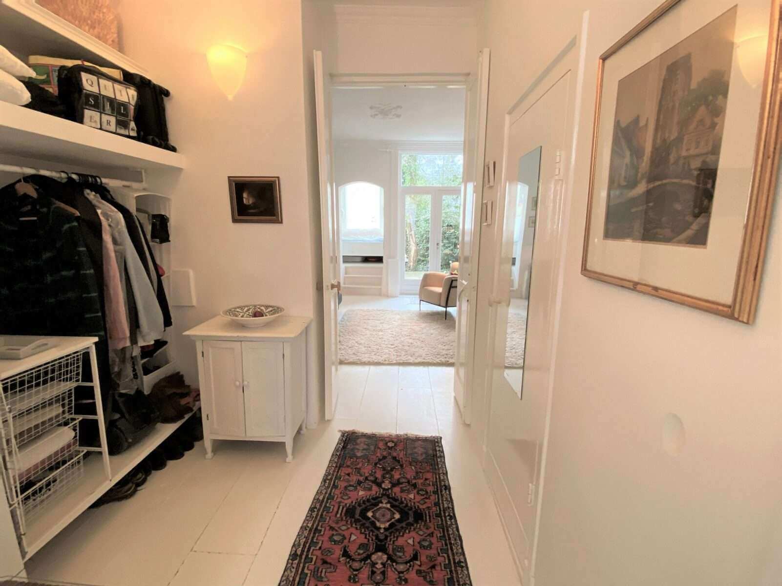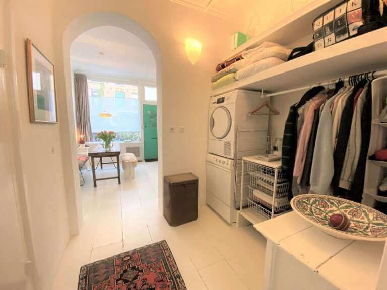 Achterin de keuken loopt u de tussenruimte binnen, hier bevinden zich de inloopkast en badkamer met toilet.