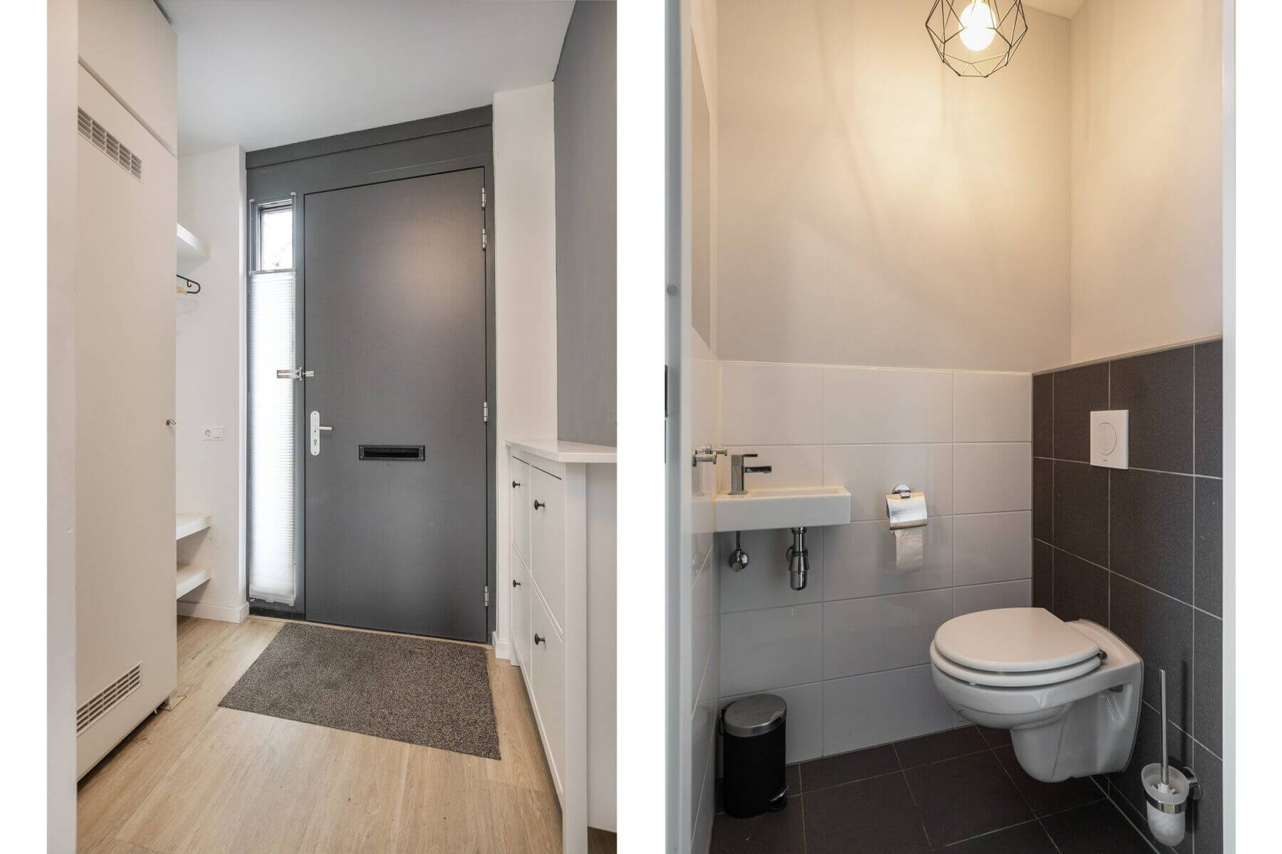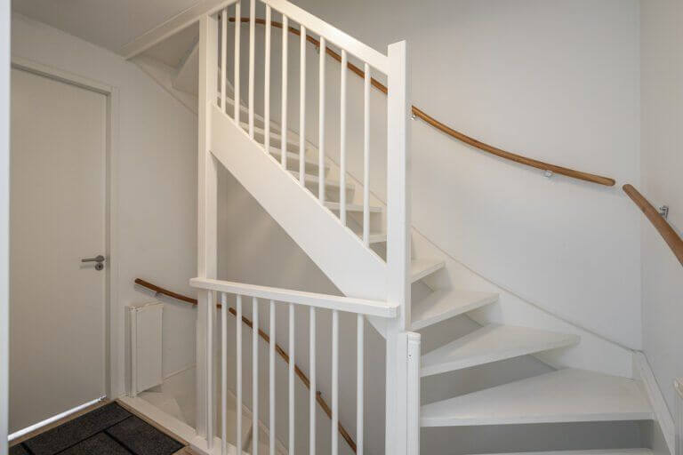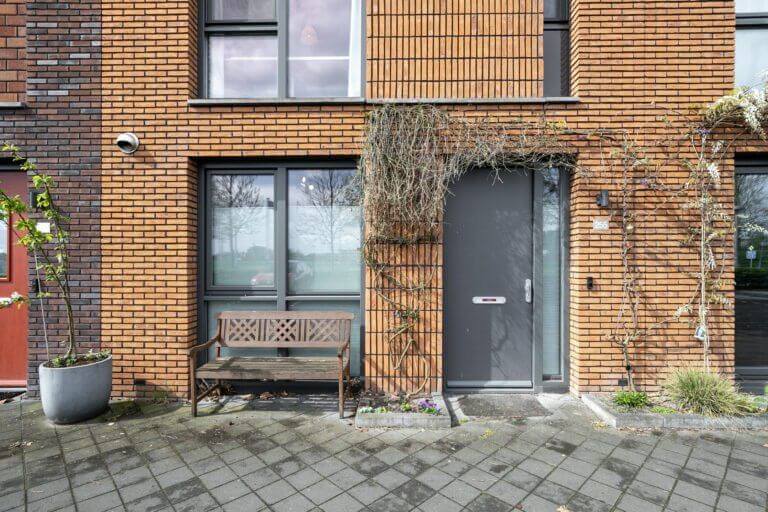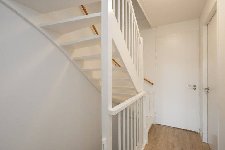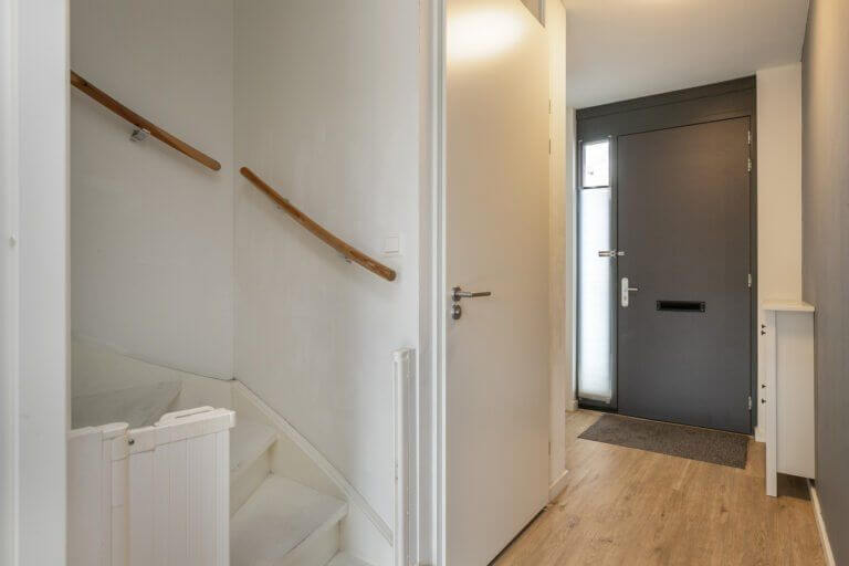 De voordeur ligt aan de straatzijde. De donkere voordeur geeft toegang tot de ruime hal, de trapopgang, het toilet (met fontein) en de leefruimten.
