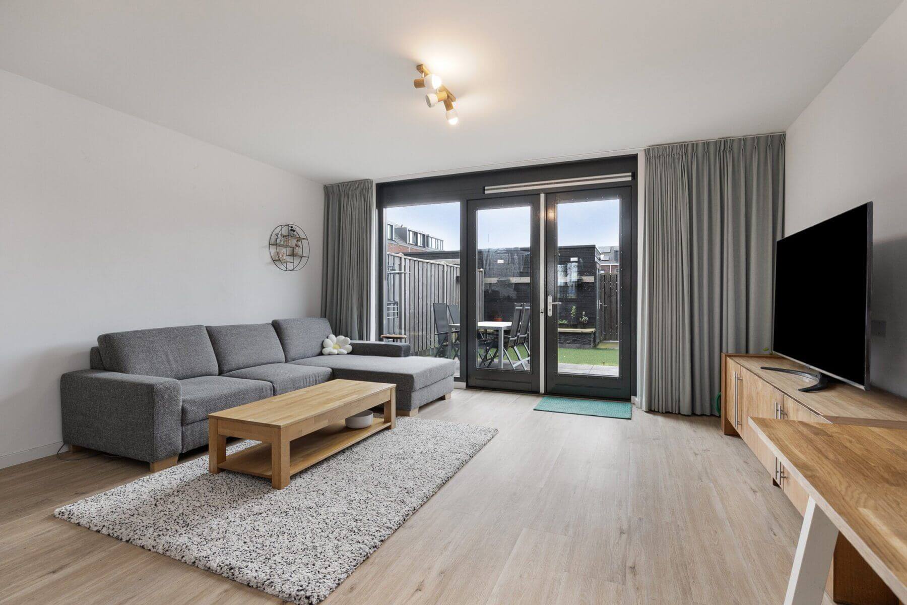 De woonkamer (met ruime trapkast) ligt aan de achterzijde, de ramen zijn hoog en licht valt binnen. Openslaande tuindeuren geven toegang tot de tuin. De achtertuin is verzorgd aangelegd en is gelegen op het zuidwesten. Achter in de tuin is een vrijstaande houten tuinberging (v.v. elektra) en poort naar het achterom.