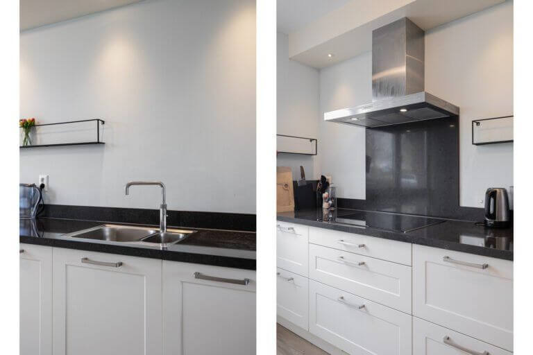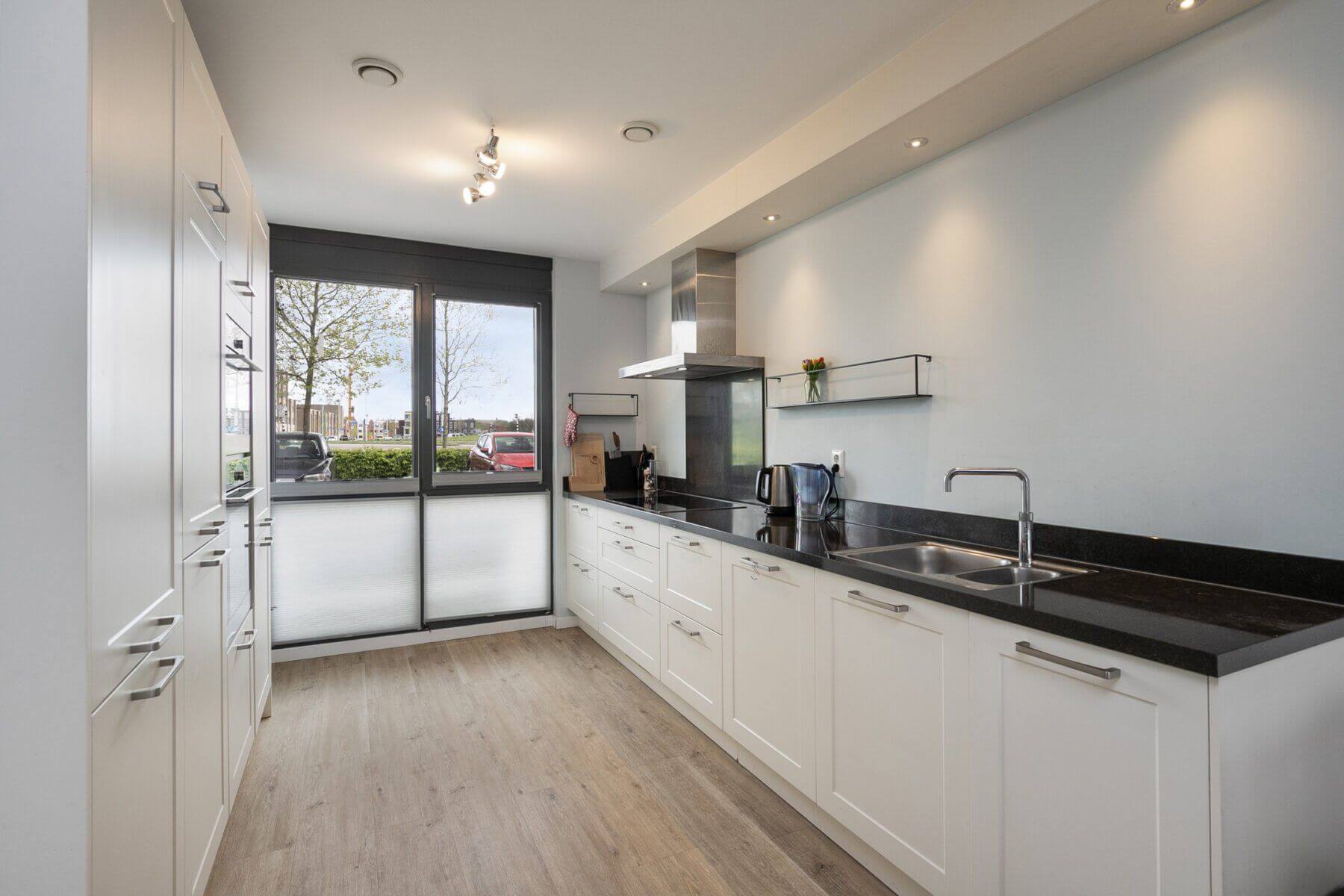 De eigentijdse lichte keuken met een donker blad en ligt aan de voorzijde en kijkt uit op de straat. De keuken beschikt naast veel bergruimte over een vaatwasser, inductie kookplaat, afzuigkap, combimagnetron, oven, combi qooker en een koel vries combinatie.