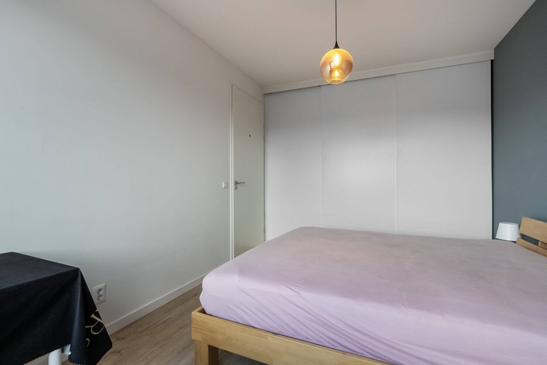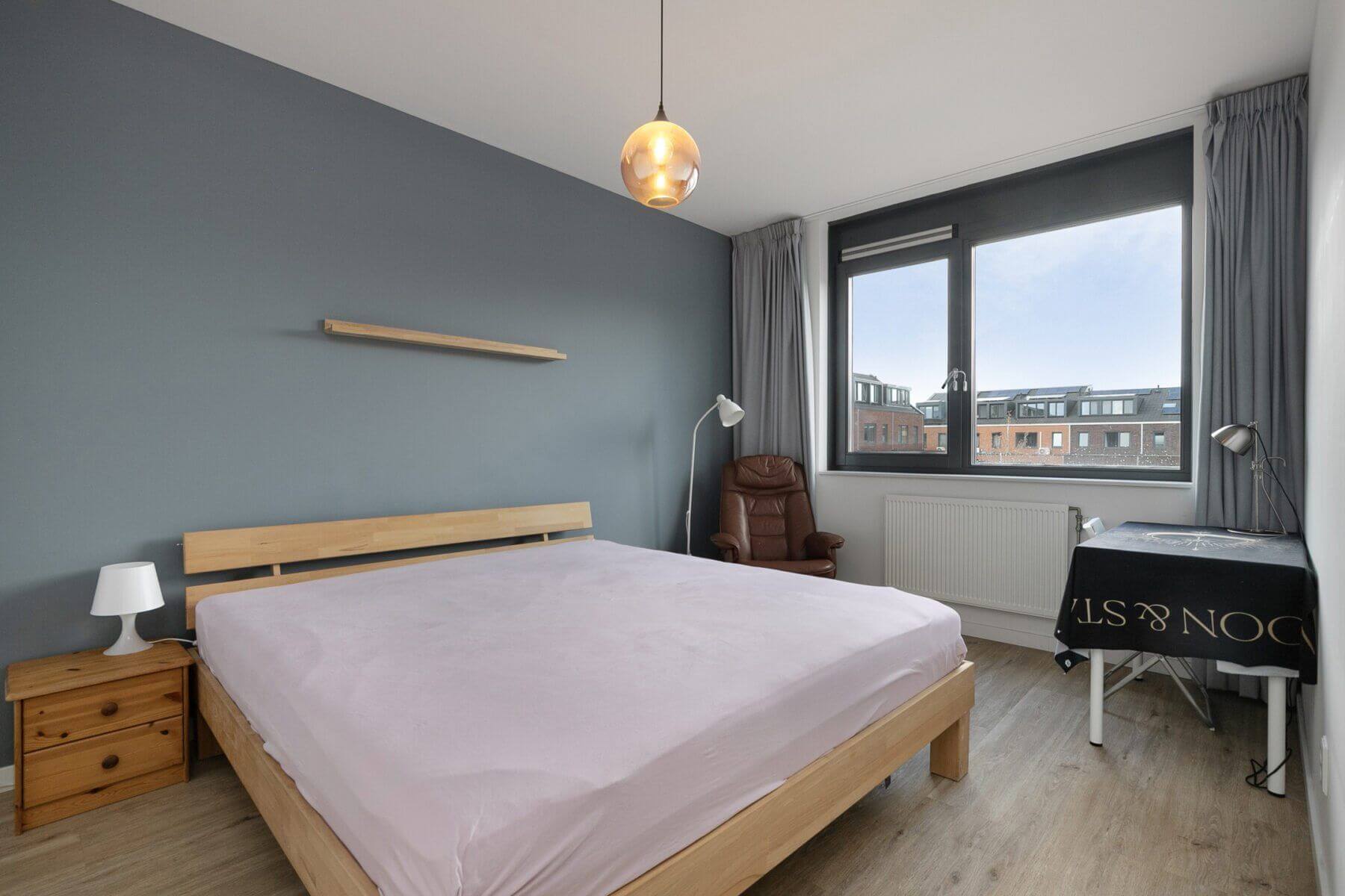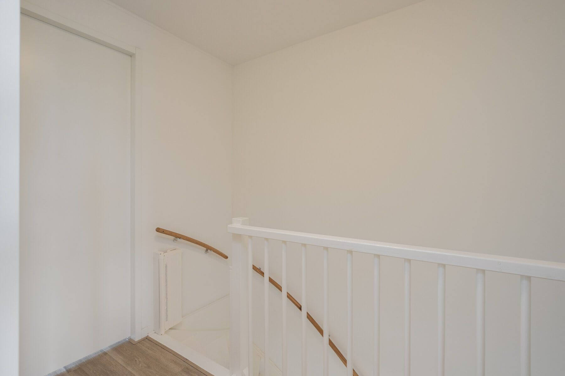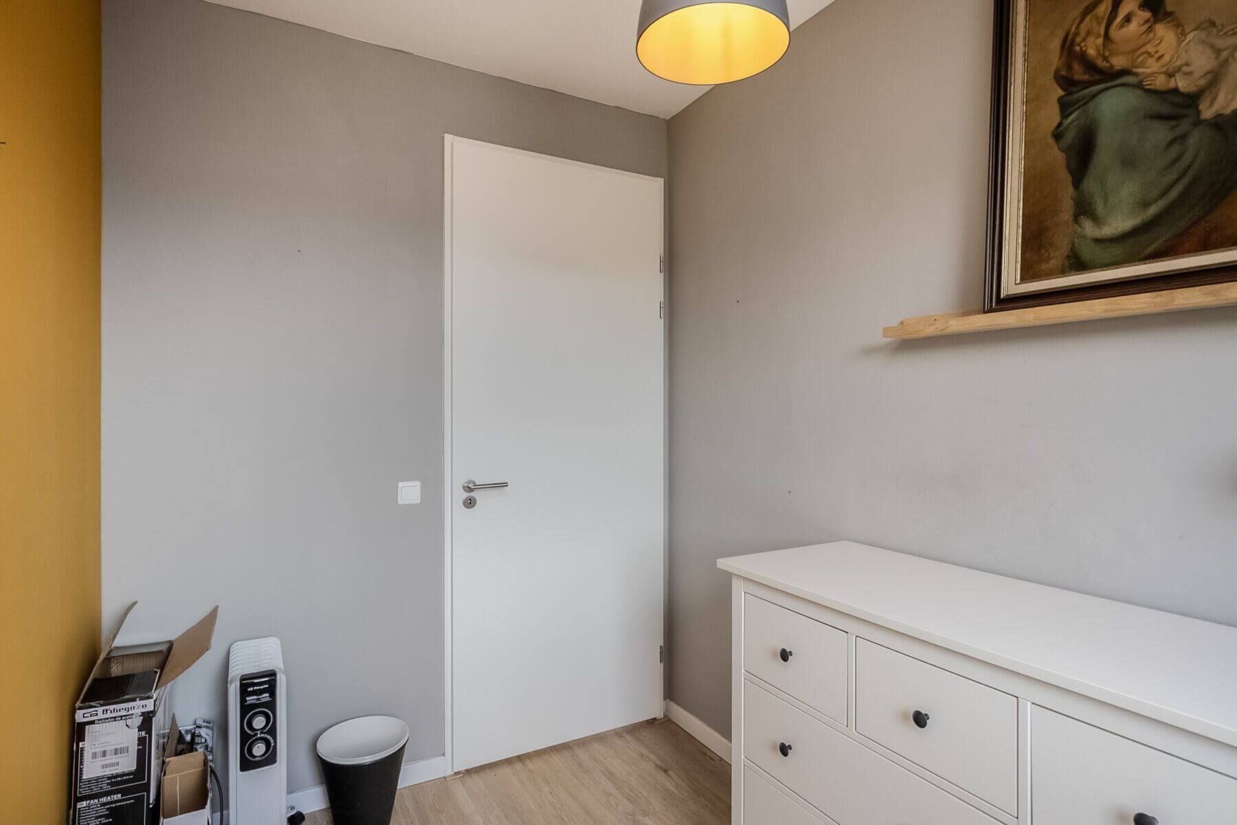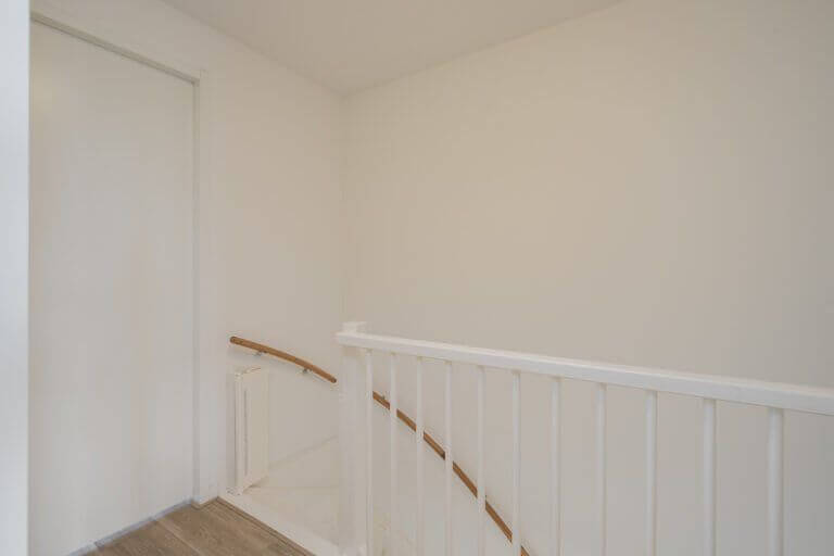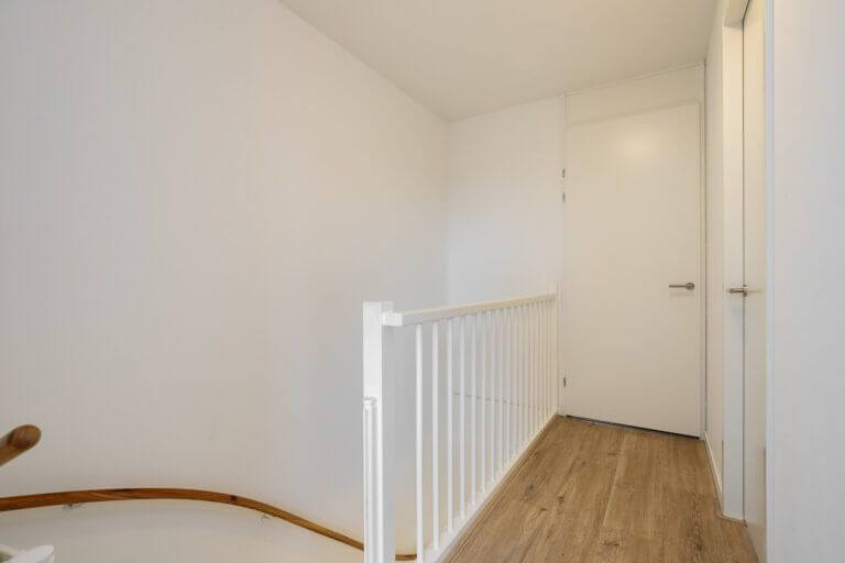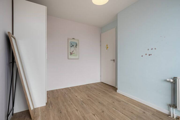 Alle wanden hebben een strakke wandafwerking. Op de vloer ligt een lichte houtstructuur laminaat met vloerverwarming.