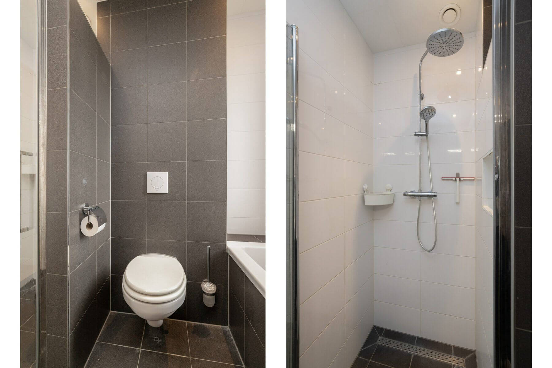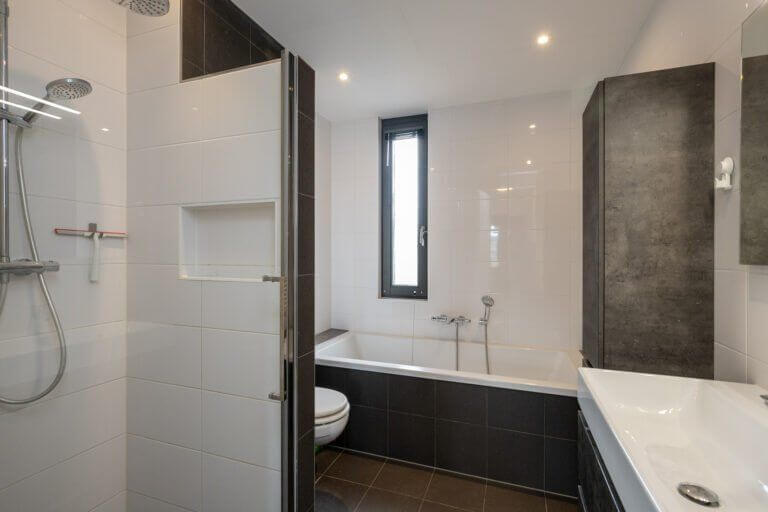 De royale chique badkamer is voorzien van een bad, een aparte (regen) douche, een zwevend toilet, strakke designradiator en een stijlvol dubbel wastafelmeubel.