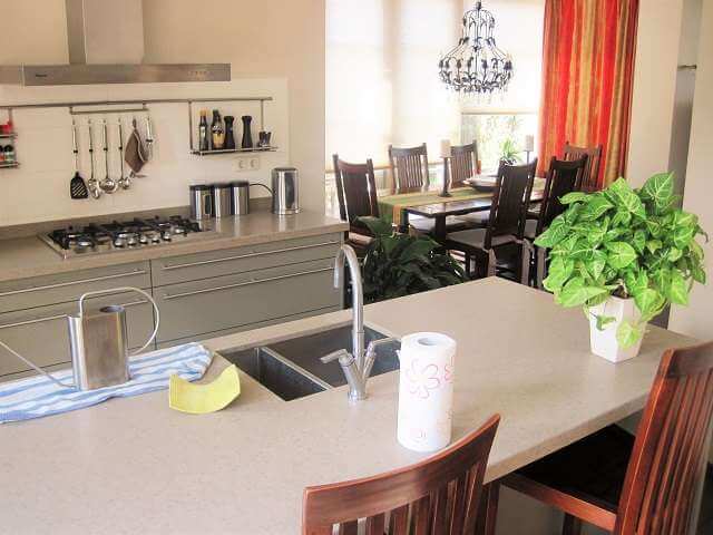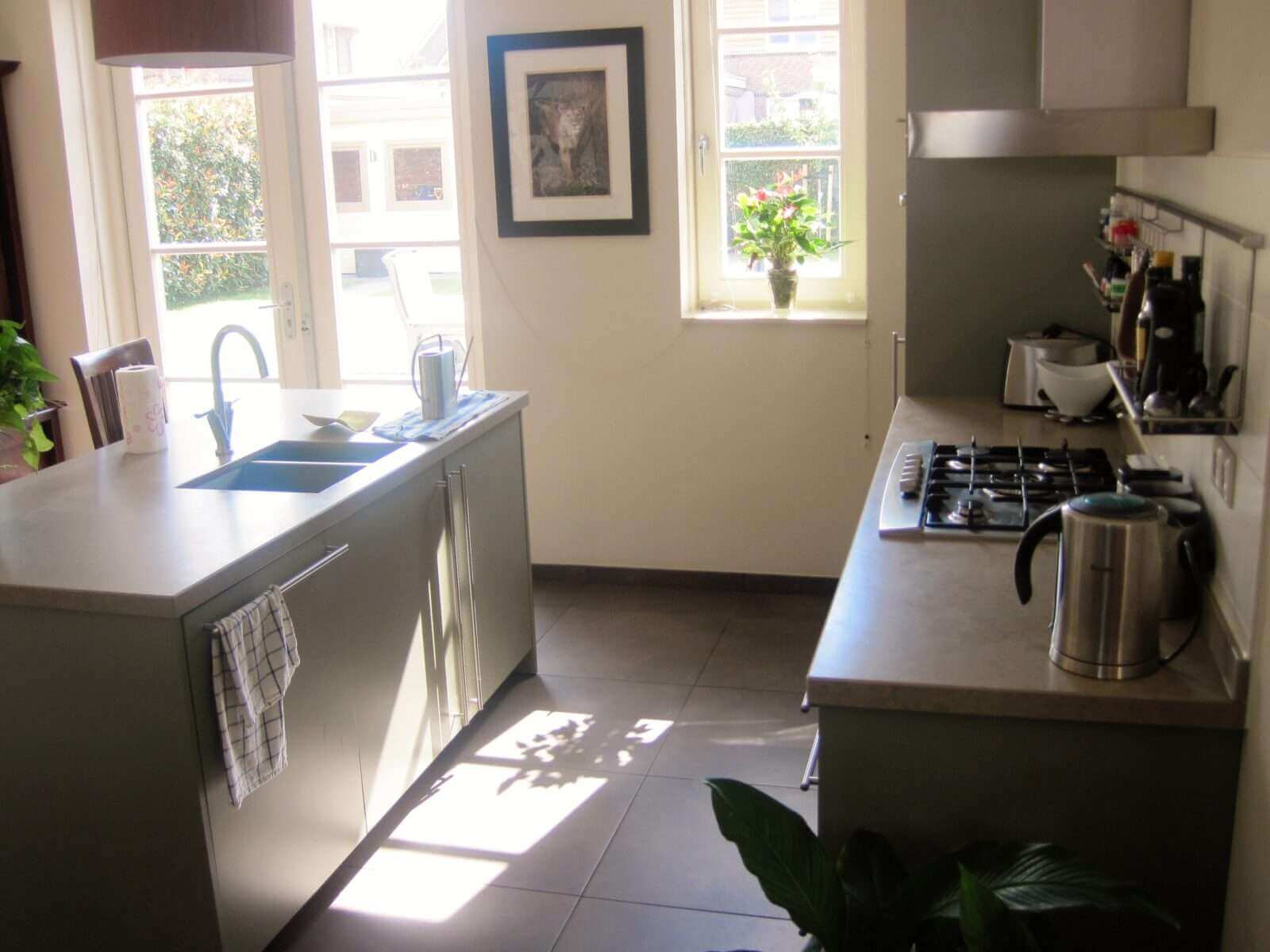 De royale zonnige L-vormige woonkamer (ca. 42 m2) is voorzien van een tegelvloer, openslaande deuren naar de achtertuin en geeft toegang tot de gedeeltelijke open woonkeuken. De woonkeuken (ca. 16 m2) is voorzien van een spoeleiland met 1,5 spoelbak, vaatwasser, 5-pits gasfornuis, afzuigkap,combi-oven en koelkast. Vanuit de keuken bereikt men de bijkeuken (ca. 3.7m2). De bijkeuken biedt toegang tot de garage (6.10 bij 3.00m), welke beschikt over een plavuizenvloer. Via een deur bereikt men de ruime achtertuin.