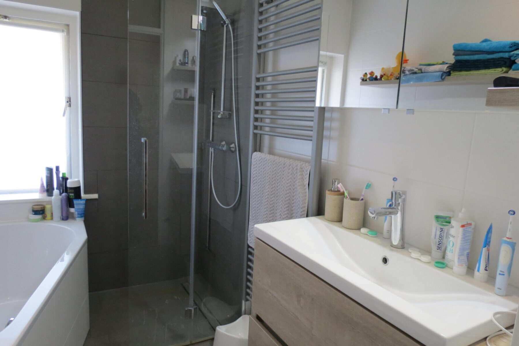 Overloop, 2 ruime slaapkamers met vaste kasten. De slaapkamer aan de achterzijde beschikt over een eigen dakterras. De badkamer heeft een bad, aparte douche en een wastafelmeubel met spiegelkast. Trapopgang naar de 2e verdieping.