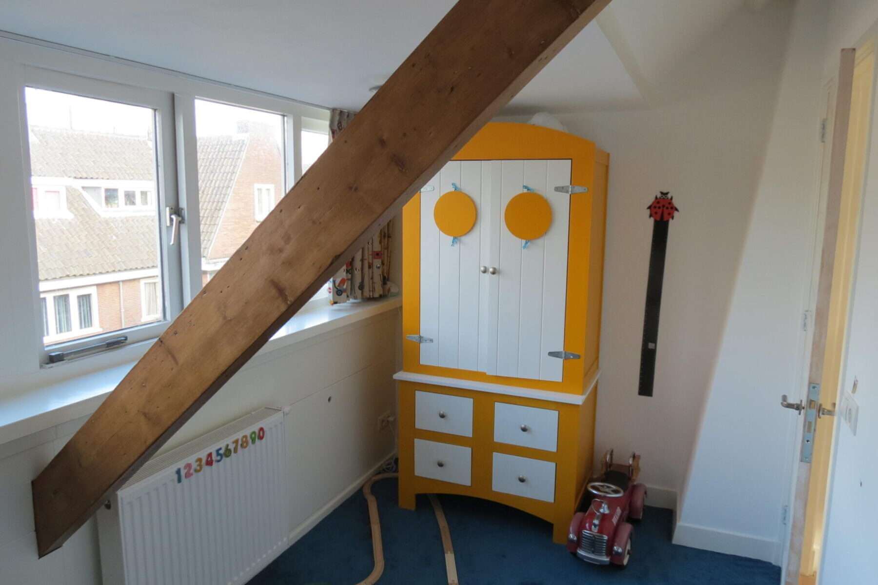 Overloop met inbouwkasten, aansluitingen voor de wasmachine en droger alsmede de CV-ketel. Royale zolderkamer met dakkapel met wastafel aan de achterzijde. Aan de voorzijde van het huis bevindt zich nog een slaapkamer met dakkapel.