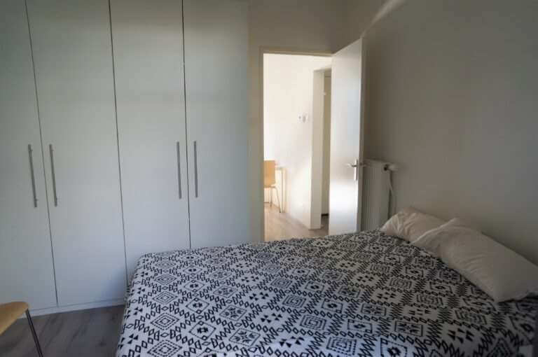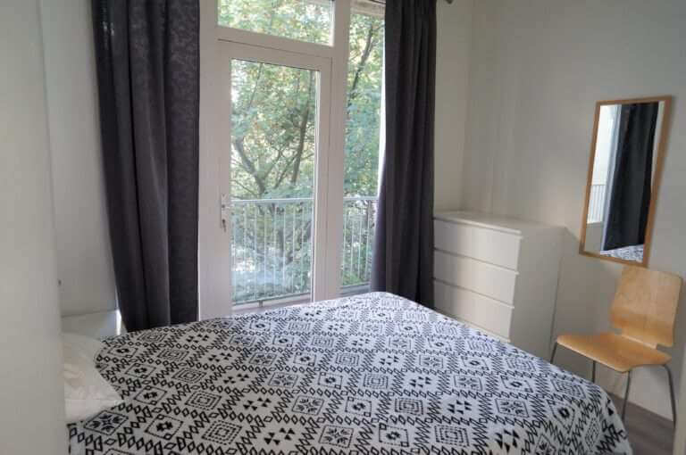 De slaapkamer bevindt zich aan de rustige achterkant van het gebouw en biedt toegang tot het ruime balkon.