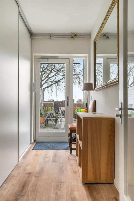 Entree via dakterras, hal met grote bergkasten, toilet, trapopgang en deur naar de keuken en woonkamer.