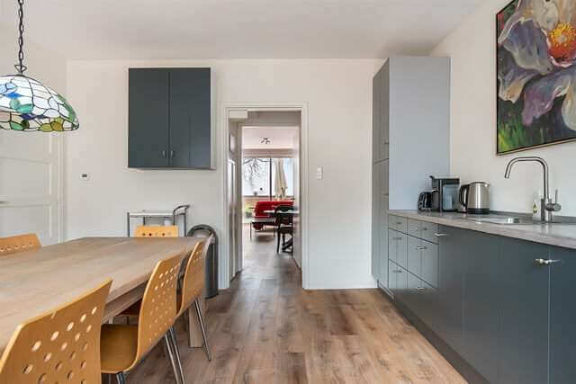 Toegang tot de woonkamer via een schuifpui en uitzicht op het dakterras. De woning is voorzien van een lichte laminaatvloer. Via de woonkamer kunt u ook de ruime keuken bereiken die is voorzien van een grote eettafel. Verder is de keuken voorzien van inbouwapparatuur: combi-magnetron, elektrische oven, inductie, koelkast en vriezer.