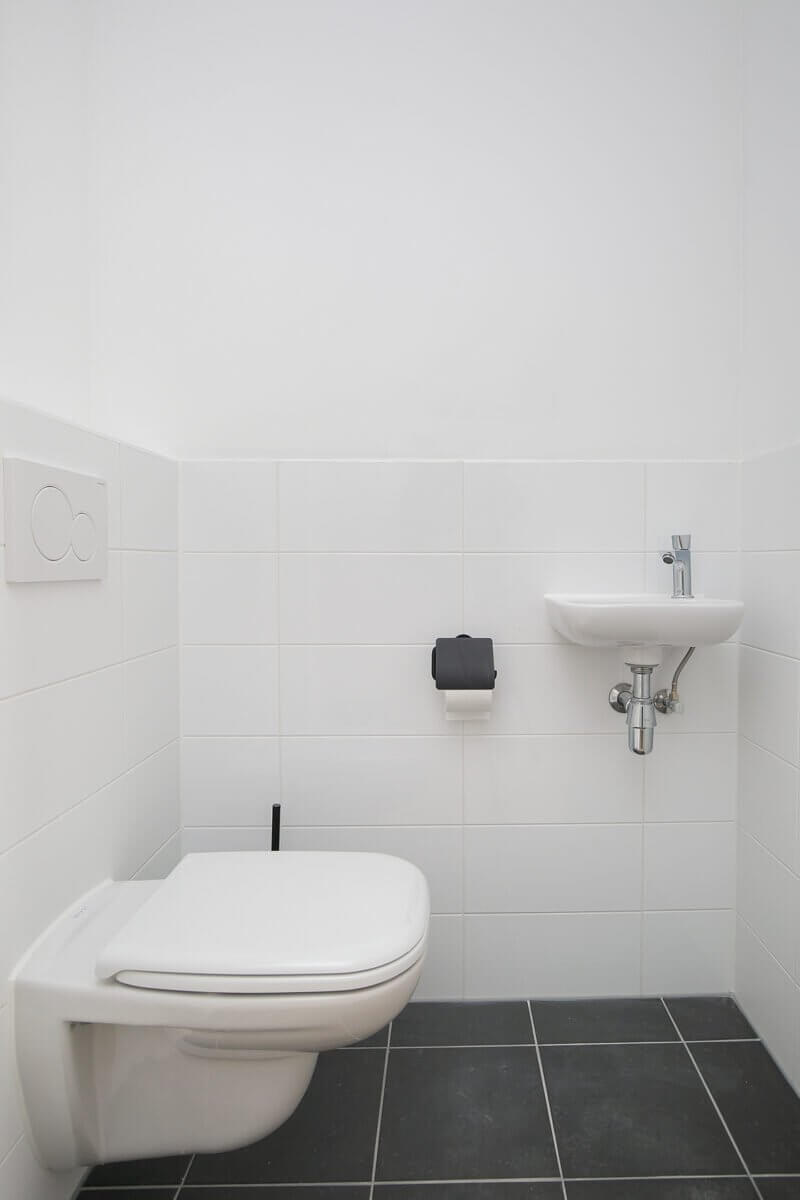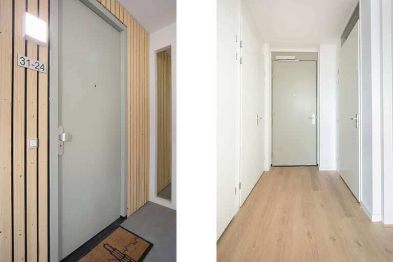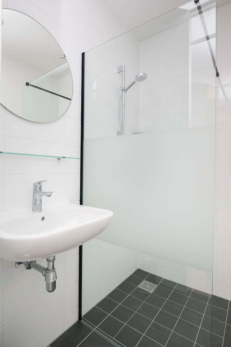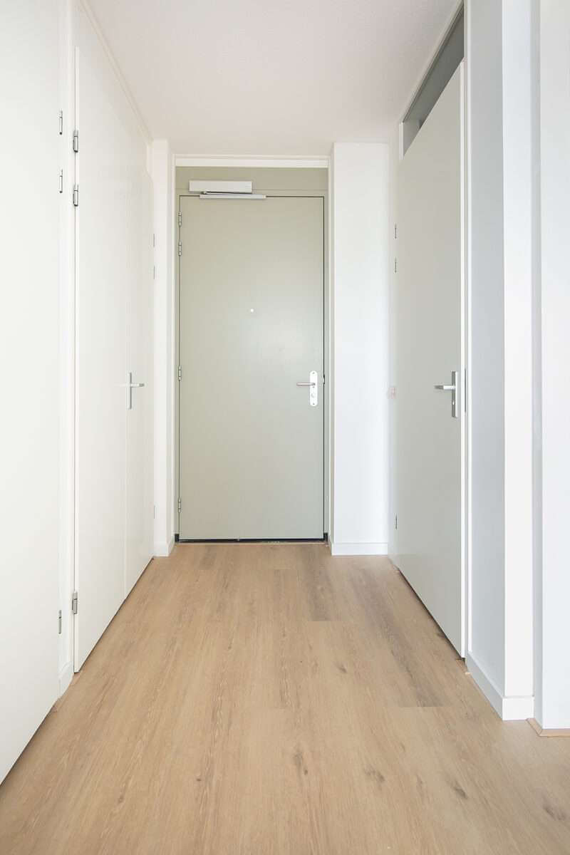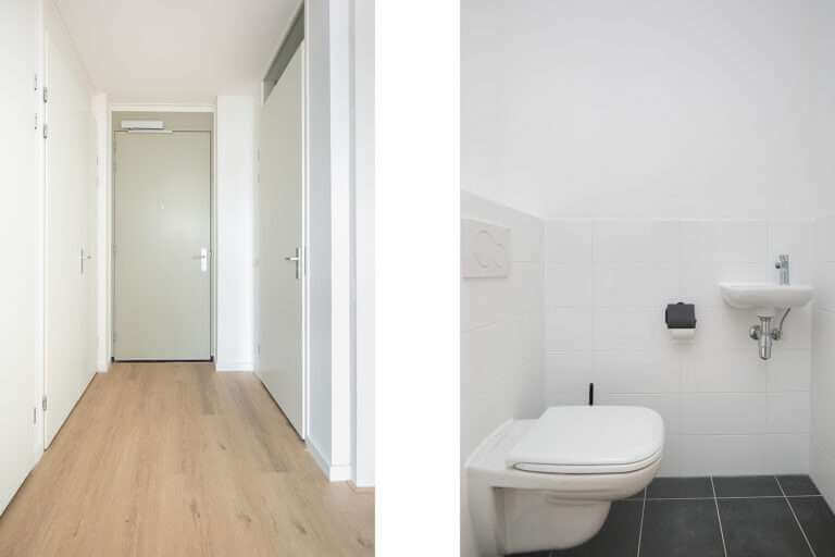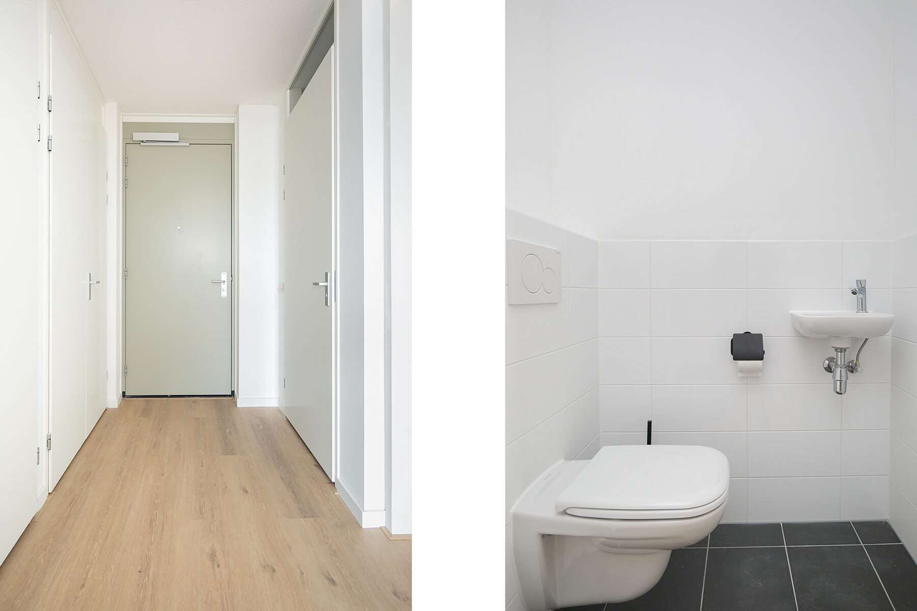 Via de voordeur kom je de ruime hal binnen. Vanuit de hal betreed je vrijwel alle ruimtes in het appartement, zoals de badkamer. De badkamer is voorzien van strakke betegeling, wastafel met planchet en een ruime inloopdouche met moderne glasafscheiding. Het toilet is apart en is ook te betreden via de hal.
