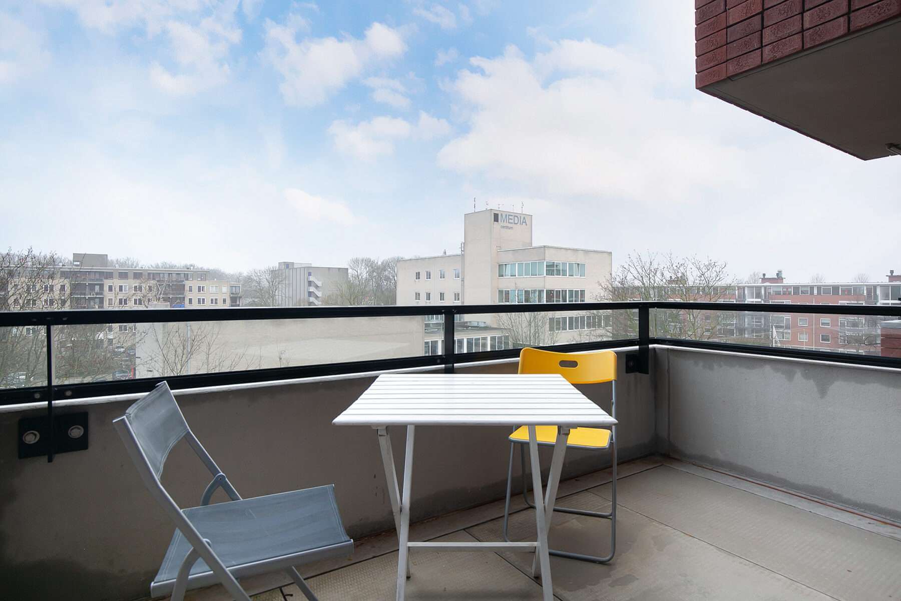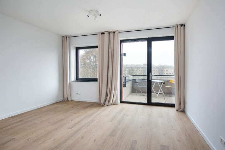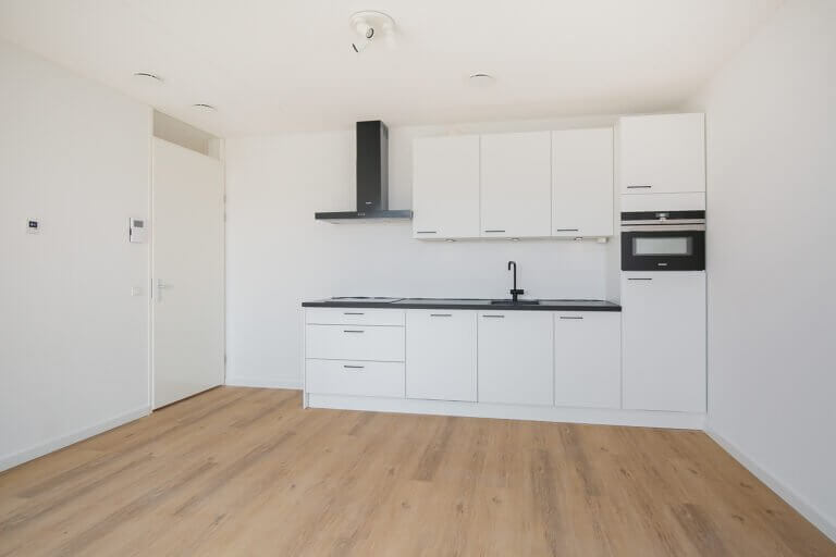 Als je een stukje doorloopt kom je in de lichte woonkamer terecht. De woonkamer is voorzien van een luxe open keuken met enkel A-Merk apparatuur, zoals: koelkast (met vriesvakje), combi magnetron oven, inductiekookplaat en een vaatwasser. Het keukenblok heeft een strak, modern design. Vanuit de woonkamer is er toegang tot het balkon. Prettig aan het balkon is dat deze ruim is in diepte, waardoor er genoeg plek is voor het ontvangen van bezoek. Grenzend aan de woonkamer, ligt de slaapkamer. Ook via de slaapkamer kun je het balkon betreden. Vanwege de balkondeur met beglazing oogt de ruimte lekker licht en ruim.