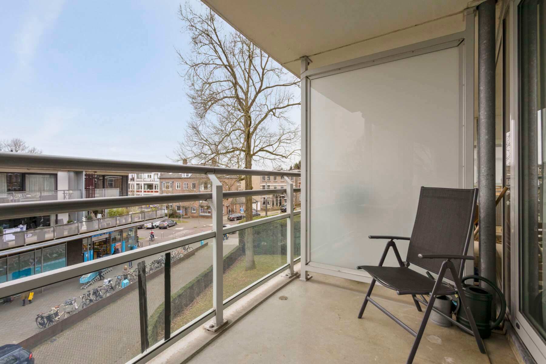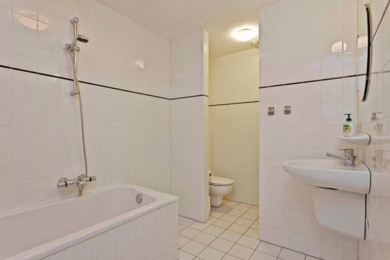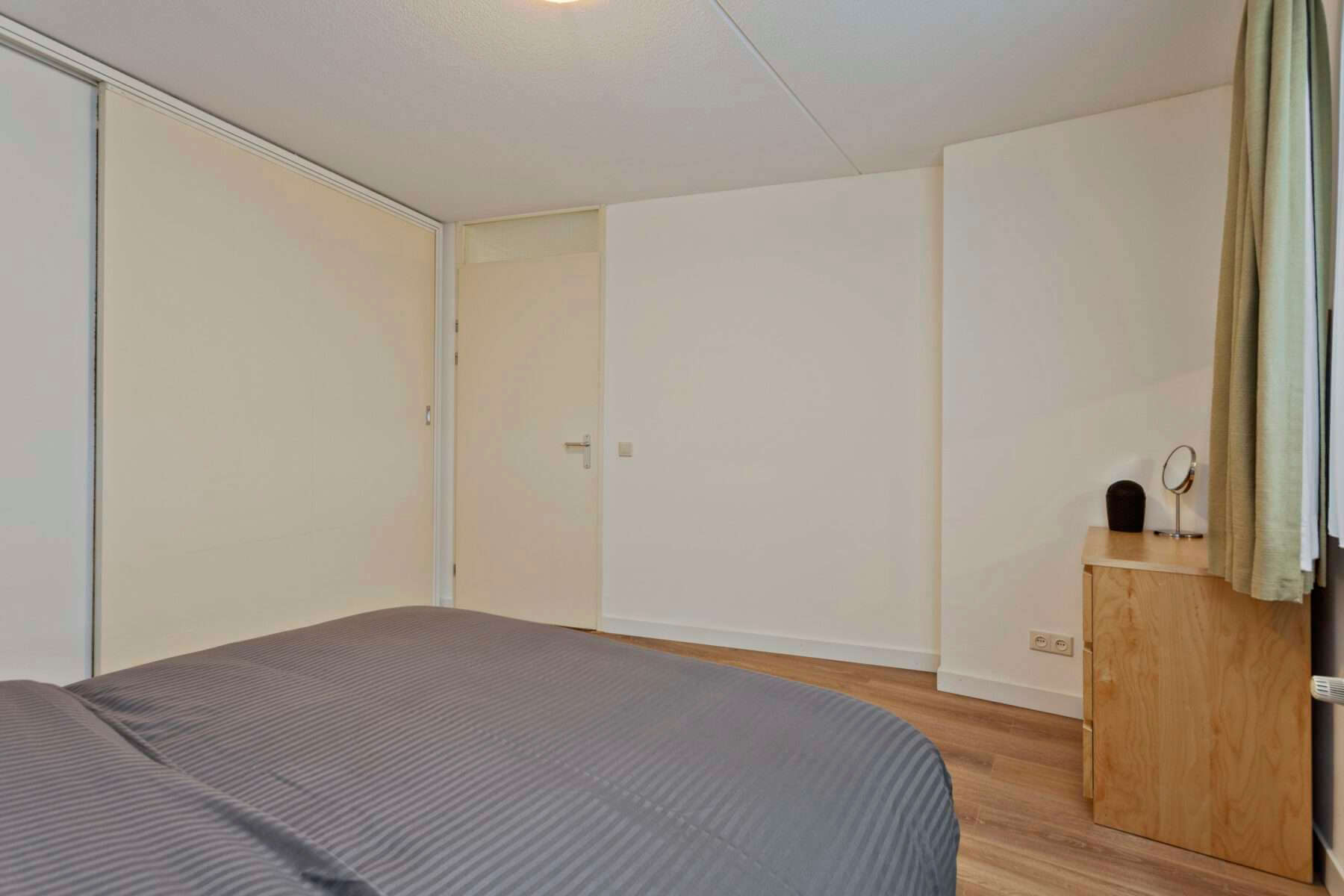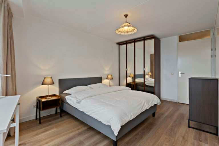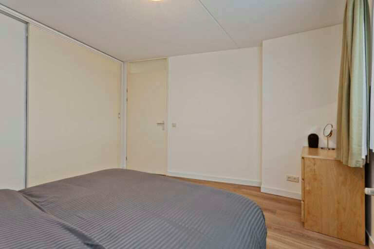 Entree, hal, berging met aansluitingen voor wasapparatuur, toilet, slaapkamer, badkamer met ligbad, separate douche, wastafel en designradiator. Woonkamer voorzien van laminaatvloer met toegang tot het royale balkon middels schuifpui. De schuifdeur geeft toegang tot een tweede slaapkamer die tevens toegang biedt tot het balkon. Open keuken voorzien van oven, keramische kookplaat, afzuigkap en vaatwasser.