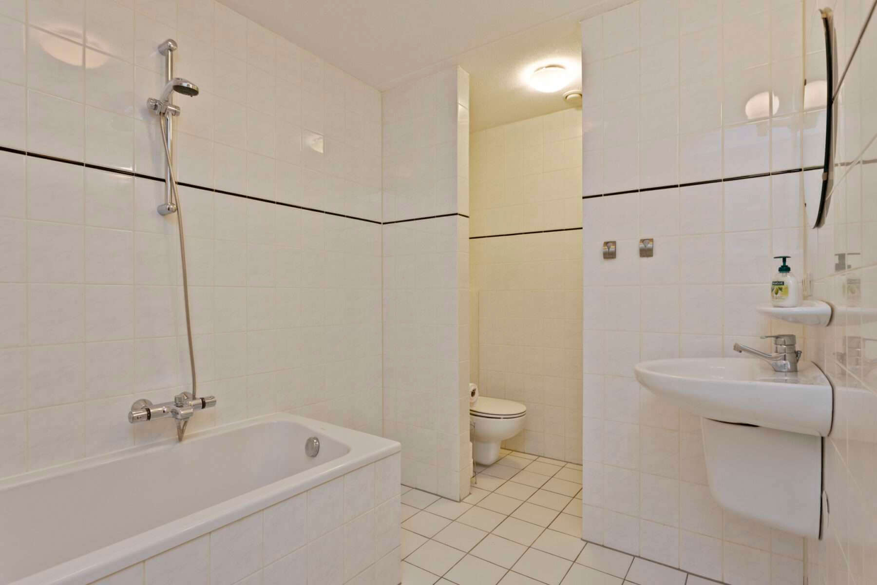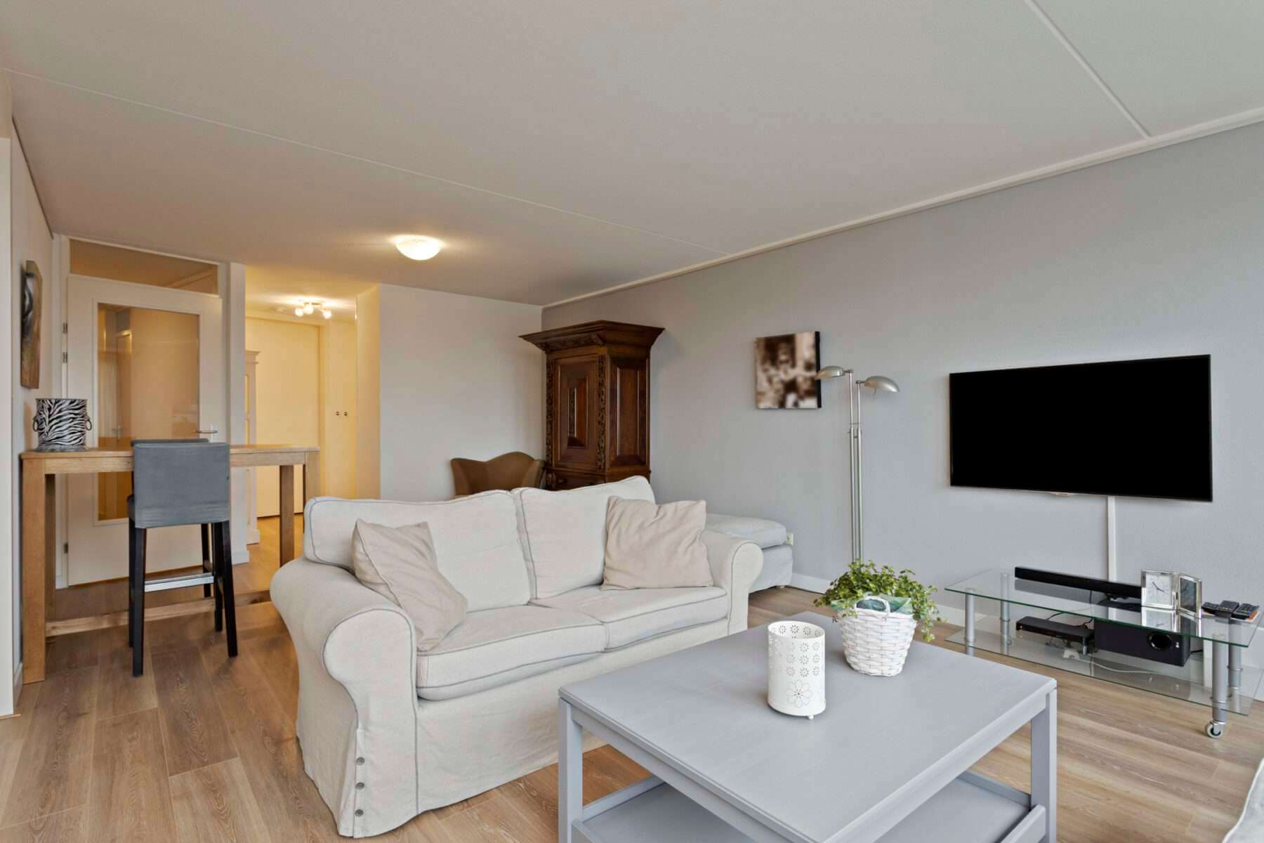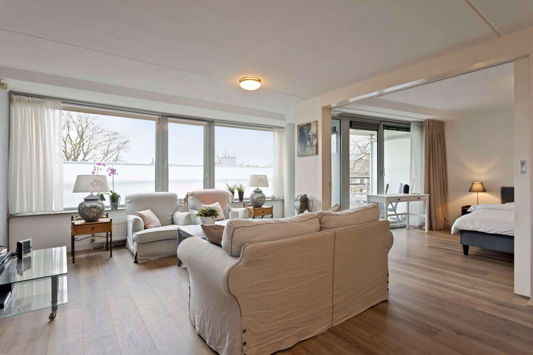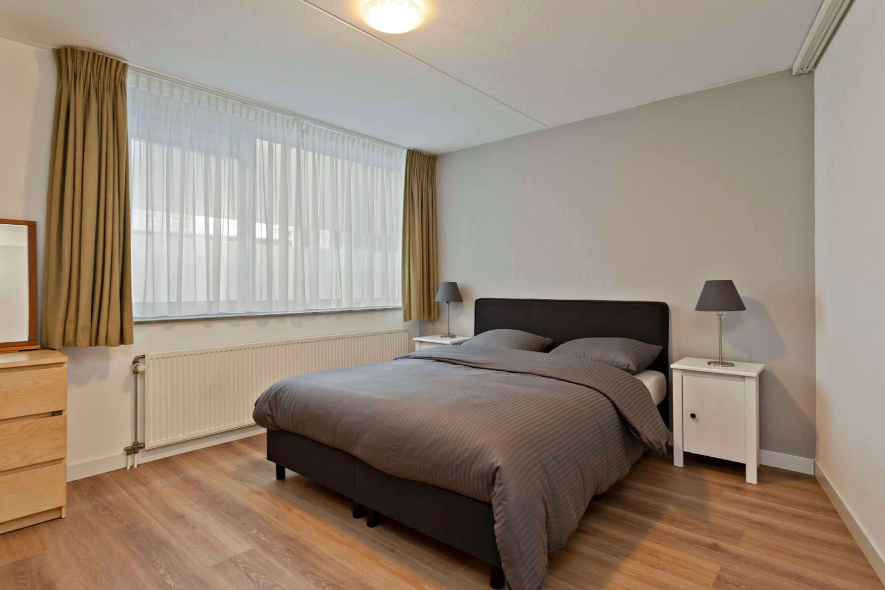 Entree, hal, berging met aansluitingen voor wasapparatuur, toilet, slaapkamer, badkamer met ligbad, separate douche, wastafel en designradiator. Woonkamer voorzien van laminaatvloer met toegang tot het royale balkon middels schuifpui. De schuifdeur geeft toegang tot een tweede slaapkamer die tevens toegang biedt tot het balkon. Open keuken voorzien van oven, keramische kookplaat, afzuigkap en vaatwasser.