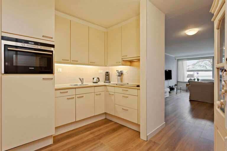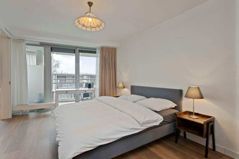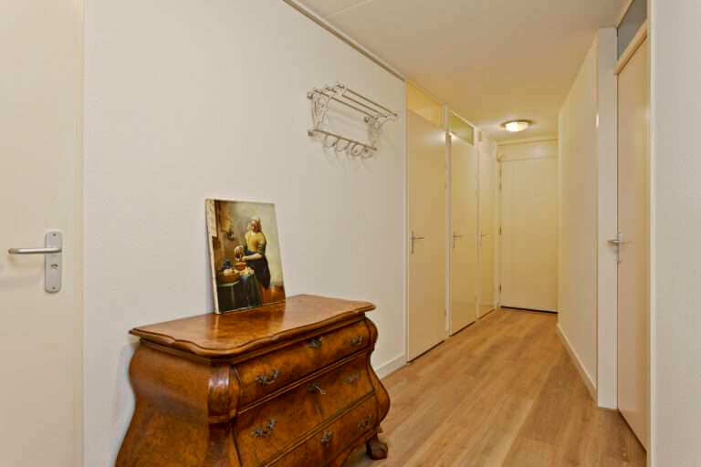 Entree, hal, berging met aansluitingen voor wasapparatuur, toilet, slaapkamer, badkamer met ligbad, separate douche, wastafel en designradiator. Woonkamer voorzien van laminaatvloer met toegang tot het royale balkon middels schuifpui. De schuifdeur geeft toegang tot een tweede slaapkamer die tevens toegang biedt tot het balkon. Open keuken voorzien van oven, keramische kookplaat, afzuigkap en vaatwasser.