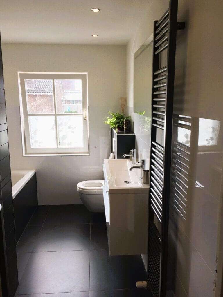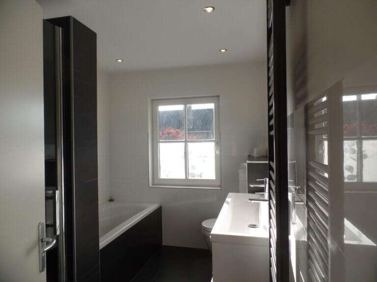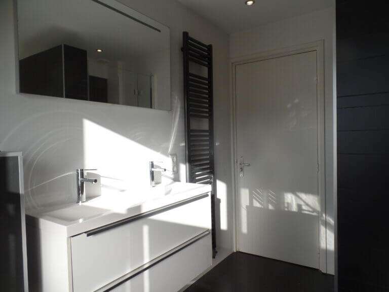 De badkamer is gelegen aan de achterzijde, heeft een luxe afwerking en is uitgerust met een douchecabine, wandcloset en een groot dubbel wastafelmeubel. Het raam in de badkamer zorgt voor een fijne lichtinval en ventilatie. De vloeren van de overloop en slaapkamers worden voorzien van een nieuwe pvc vloer. Op deze verdieping vindt u tevens een wasruimte met de opstelling voor de wasmachine en droger.
