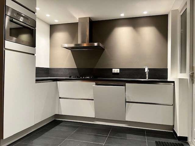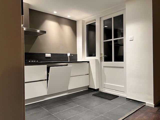 De sfeervolle keuken is voorzien van een L- opstelling met diverse boven- en onderkasten en is voorzien van een , afzuigkap, vaatwasser. Via de achterdeur is de ruime achtertuin met vrijstaande stenen garage te bereiken.