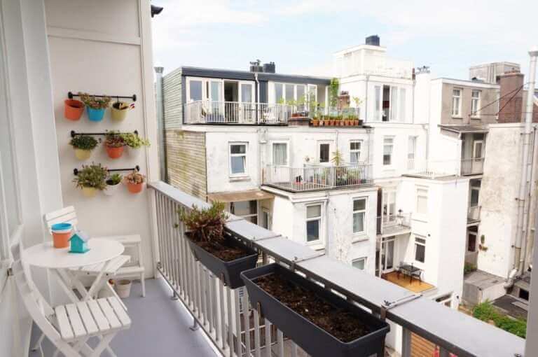 The third floor contains the living room and open modern kitchen with a sunny balcony at the back.