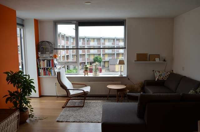 De woonkamer is een gezellige leefruimte met prettig lichtinval en een deur naar het balkon. Op de vloer ligt keurig laminaat met een warme uitstraling.