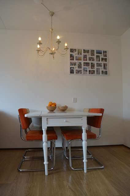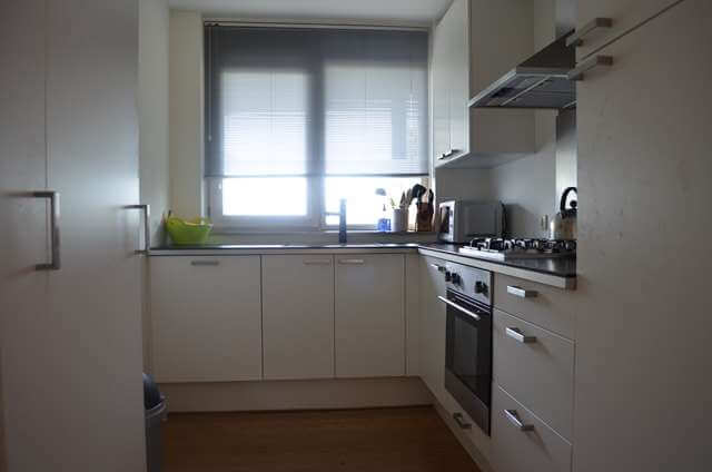 Vanuit de woonkamer bereik je de open keuken. De hoekopstelling heeft veel bergruimte in de onder- en bovenkasten en diverse apparatuur is ingebouwd: een gaskookplaat met afzuigkap, oven, vaatwasser en een koelkast.