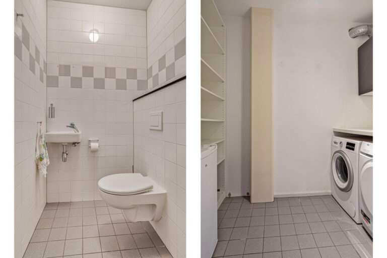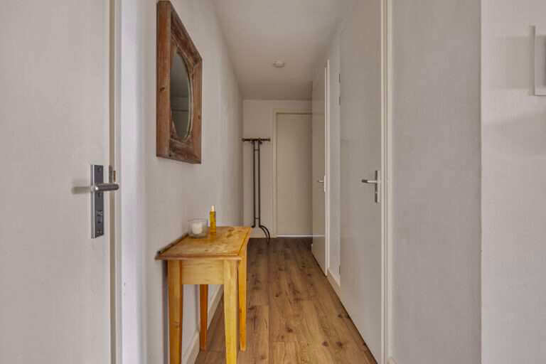 Royale entree, toilet met fonteintje, wasruimte voor wasmachine en droger. Sfeervolle woonkamer met geweldige lichtinval, en openslaande deuren naar het terras gehele breedte van het appartement.