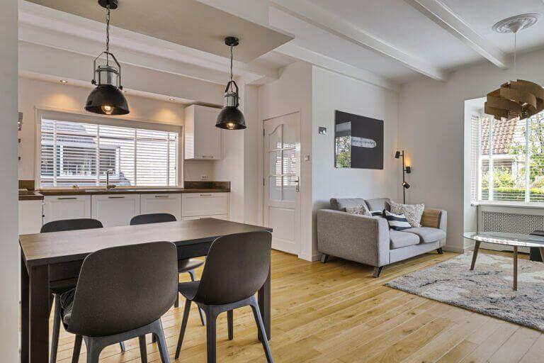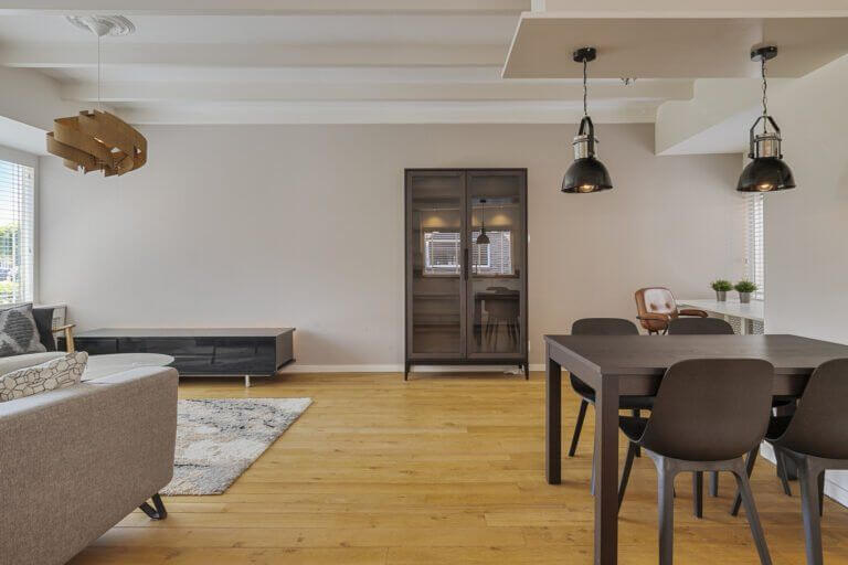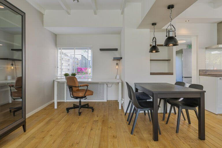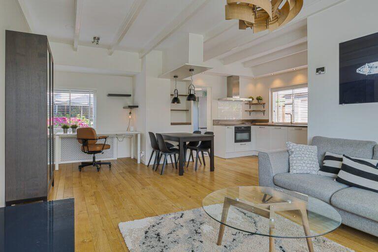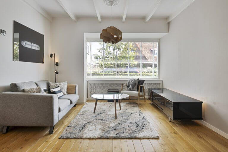 De sfeervolle woonkamer is voorzien van strak gestuukte wanden en plafond en op de vloer ligt een mooie laminaatvloer. De mooie erker aan de voorzijde geeft de woonkamer extra charme.