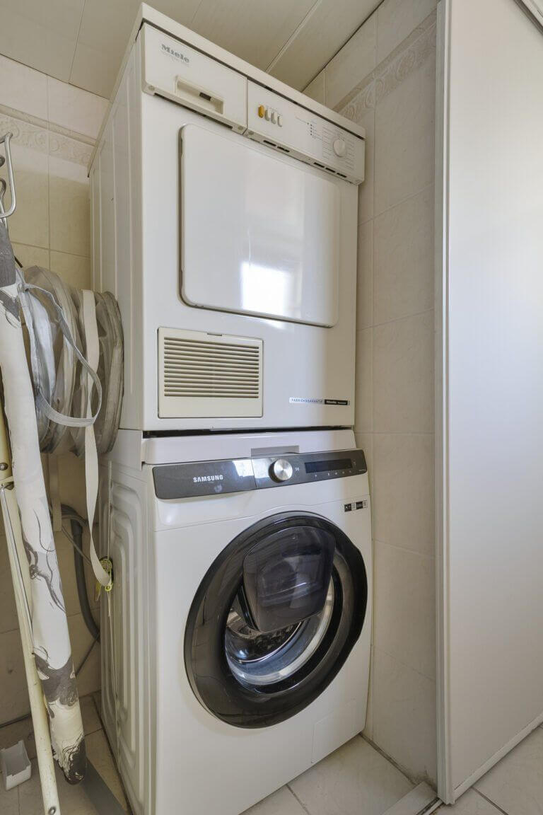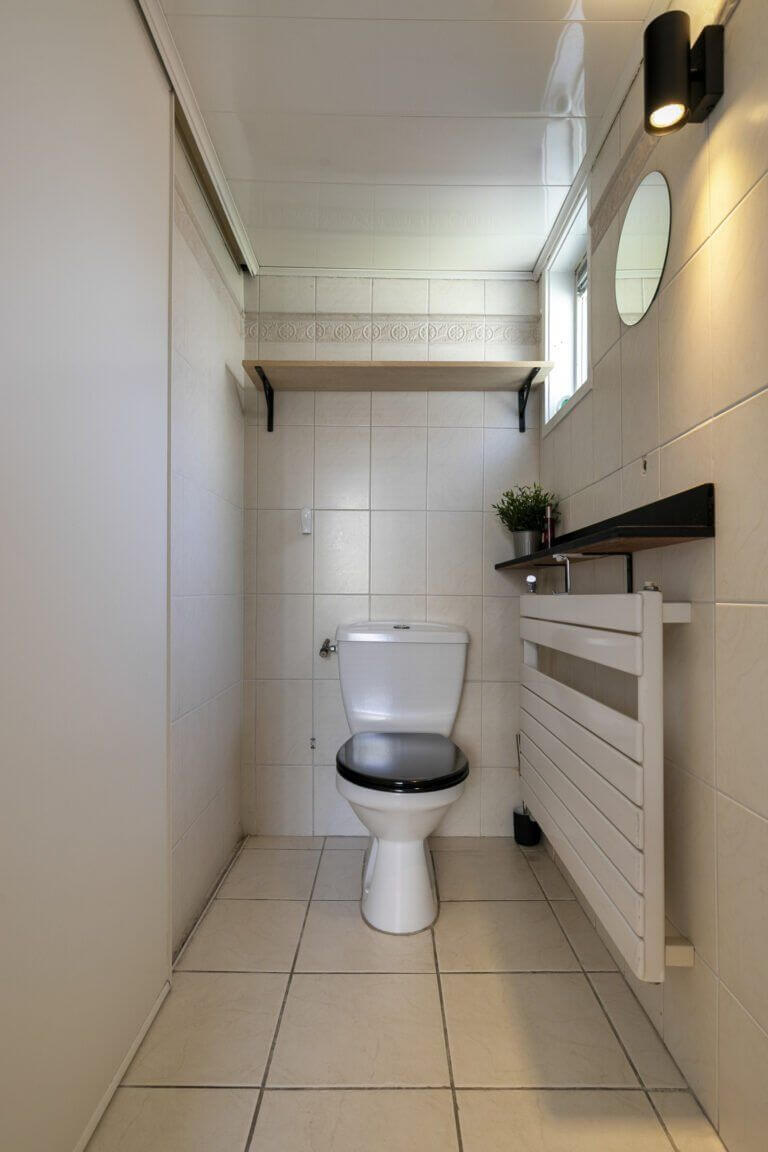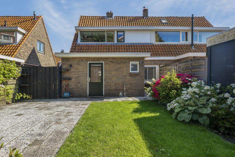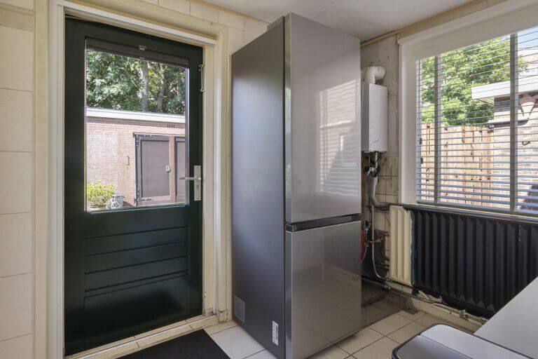 Vanuit de keuken komt u in de handige bijkeuken met toegang tot de wasruimte met de opstelling voor de wasmachine en droger en de toegang tot het toilet op de begane grond. Via de tuindeur is de achtertuin bereikbaar.
