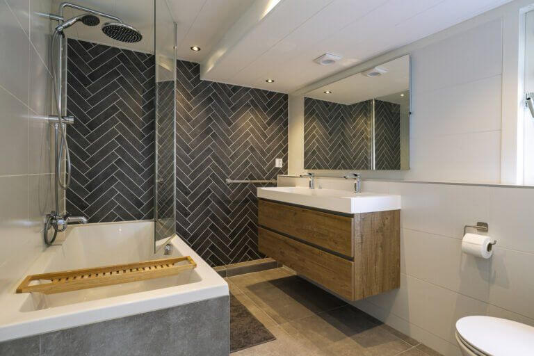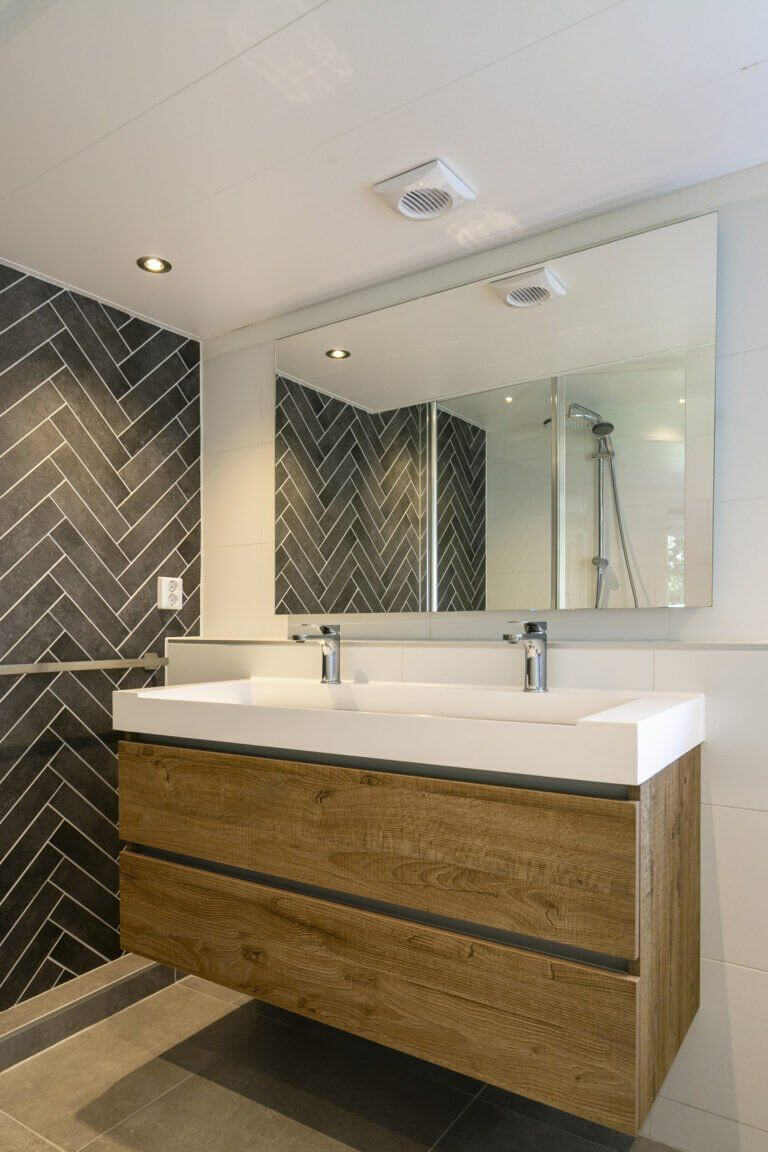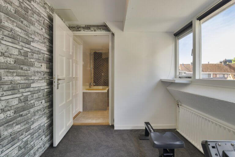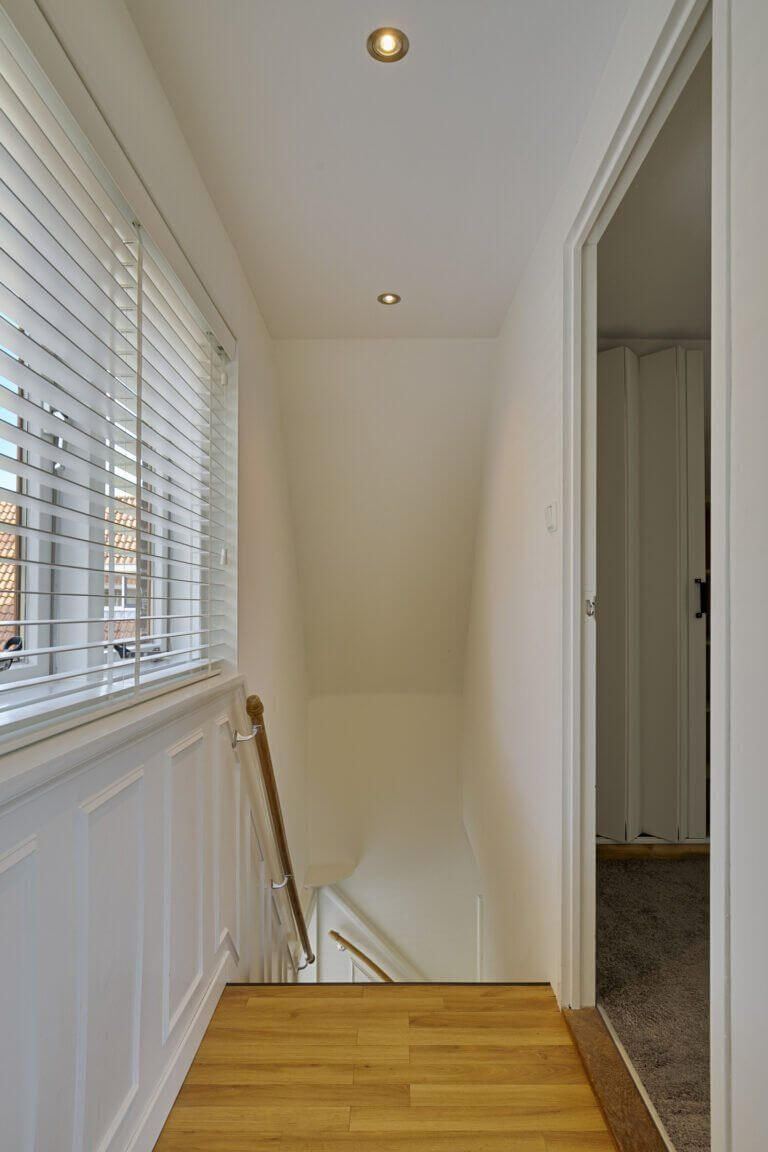 Overloop met toegang tot twee slaapkamers. Vanuit beide slaapkamers heeft u rechtstreeks toegang tot de prachtige ruime badkamer met dubbele wastafel met ombouw en grote spiegel, ligbad met regendouche, 2e toilet en designradiator.