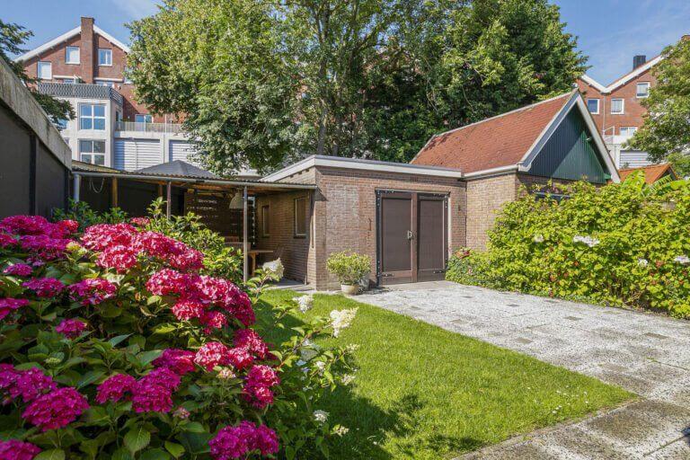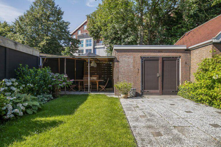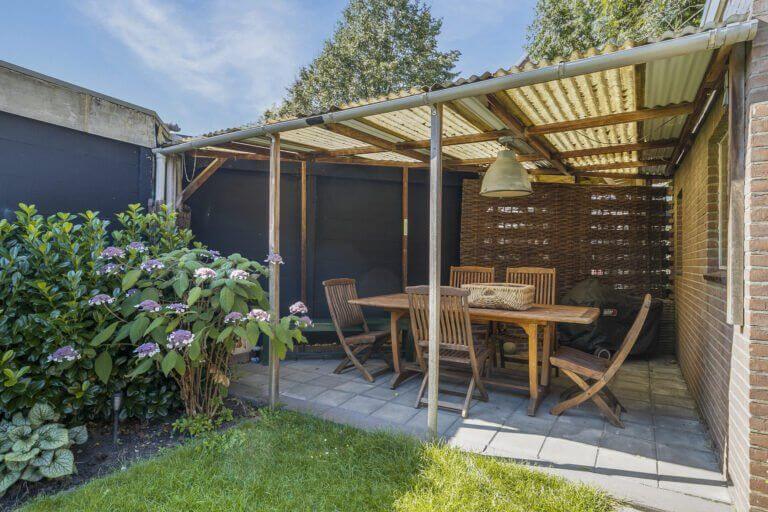Via de bijkeuken komt u in de achtertuin met toegang tot de vrijstaande stenen garage en de gezellige overkapping waar u in de zomer heerlijk buiten kunt dineren. De zijtuin is afgeschermd van de achtertuin via een houten poort.