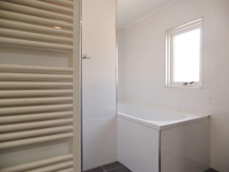 Entree, hal met toegang tot separaat toilet, kast met combiketel, badkamer, voorzien van ligbad, inloopdouche, designradiator en vaste wastafel met ombouw en handdoekenkast, twee slaapkamers, woonkamer met open keuken. Vanuit de woonkamer bereikt u de derde slaapkamer. De woonkamer beschikt over een schuifpui naar een klein stenen bordes met aansluiten de volledig betegelde tuin. De open keuken is voorzien van diverse inbouwapparatuur zoals een koelvries combinatie, vierpits gasfornuis, combi oven magnetron, afzuigkap en opstelling met aansluiting voor een wasdroogmachine.