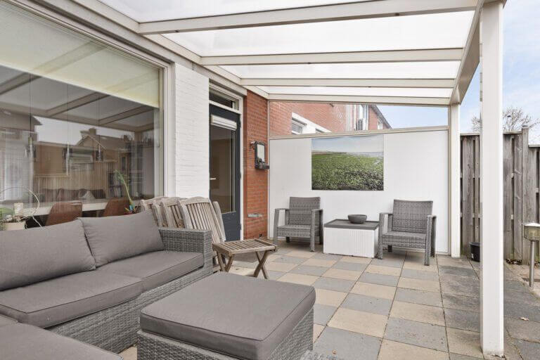 Via de keukendeur loopt u de onderhoudsarme achtertuin in met een heerlijke veranda overkapping en een vrijstaande houten berging.