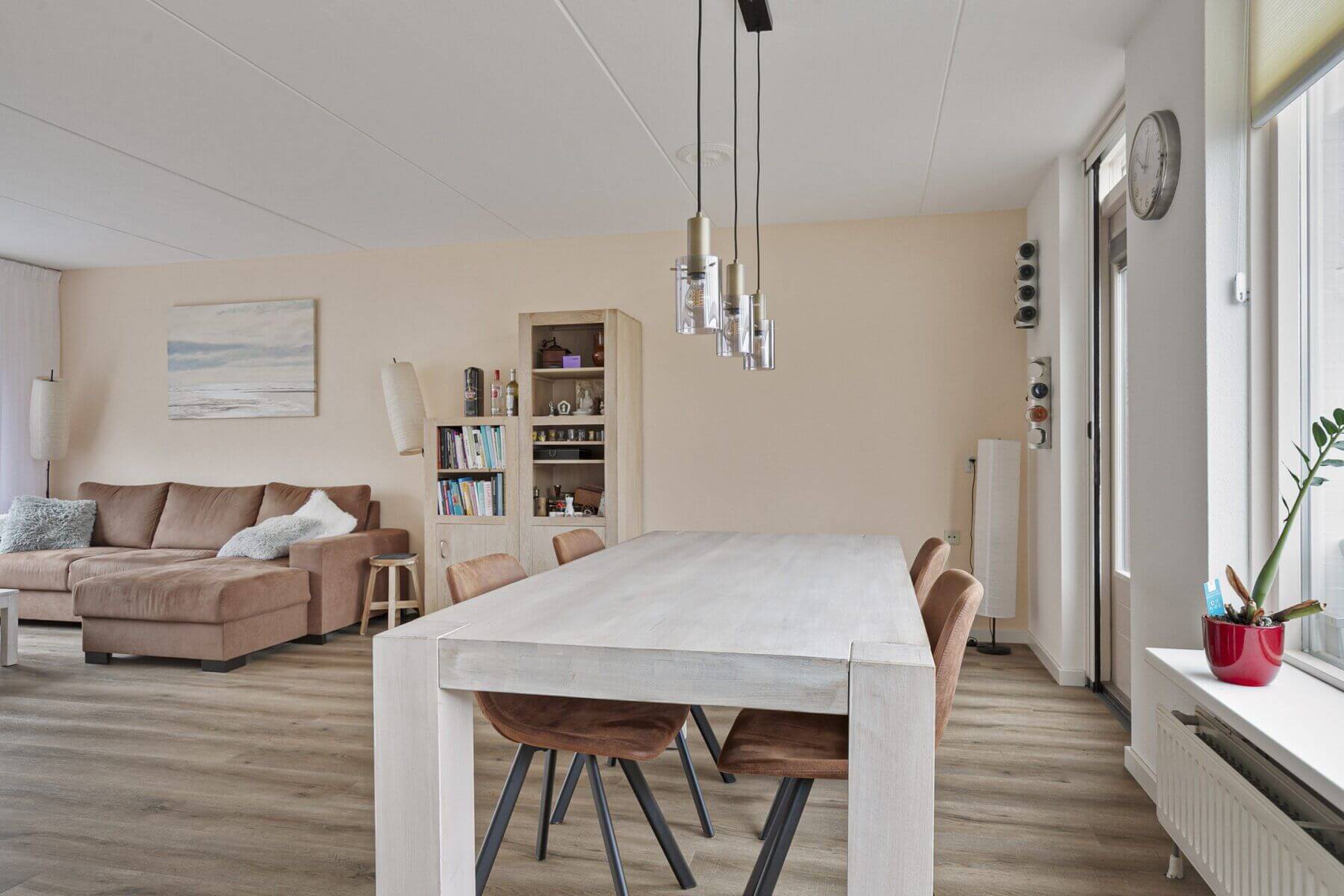 Lichte woonkamer aan de voorkant, welke overloopt in het eetgedeelte aan de achterkant met open keuken en diverse inbouwapparatuur, koel/vriescombinatie, afwasmachine, inductie kookplaat met afzuiging en een oven met magnetronfunctie.