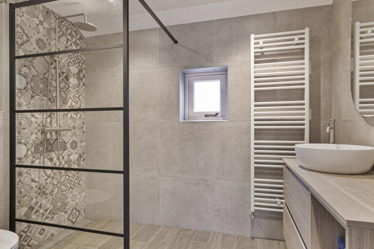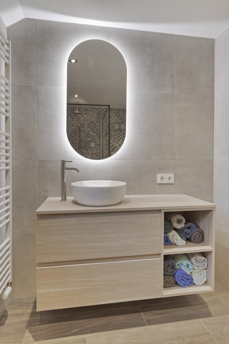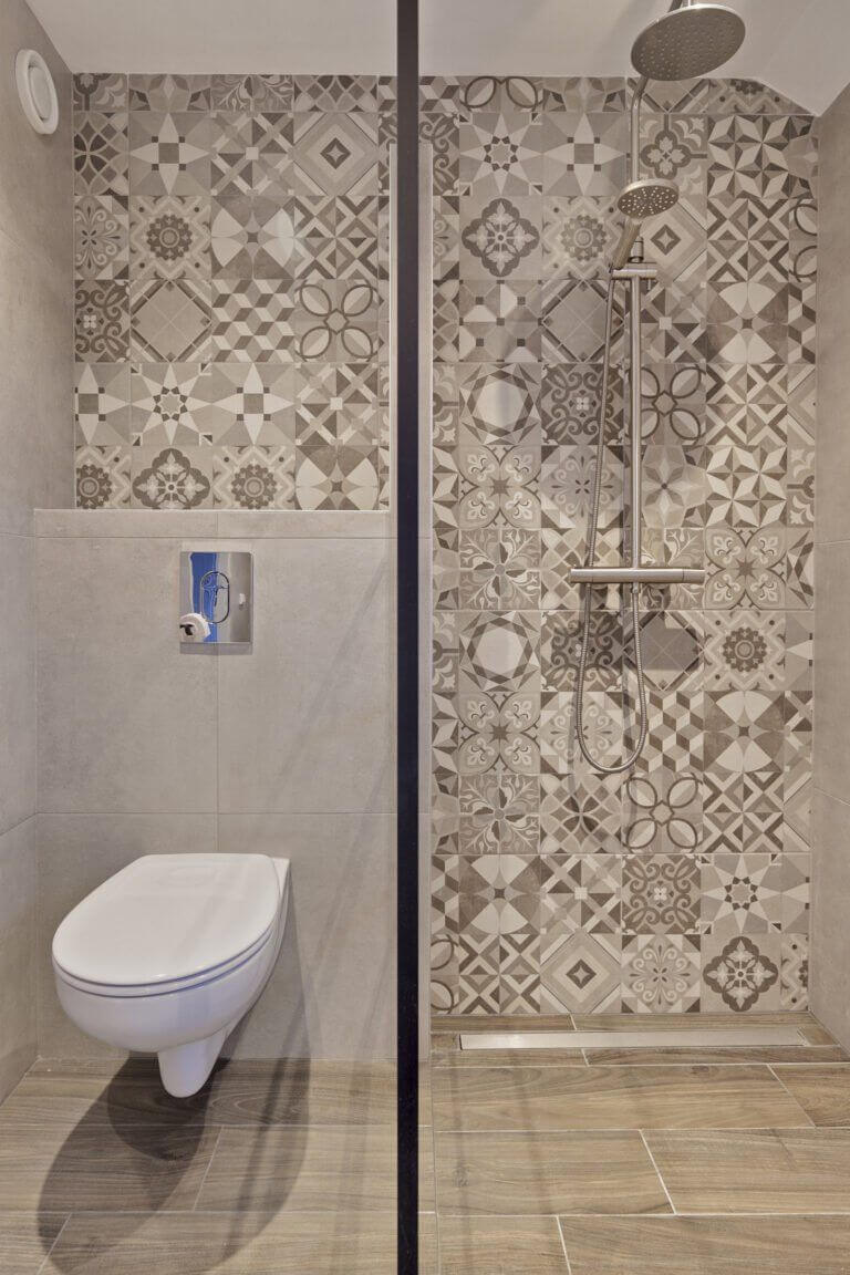 Overloop, 2 slaapkamers, nieuwe luxe badkamer met inloopdouche, toilet en wastafelmeubel.