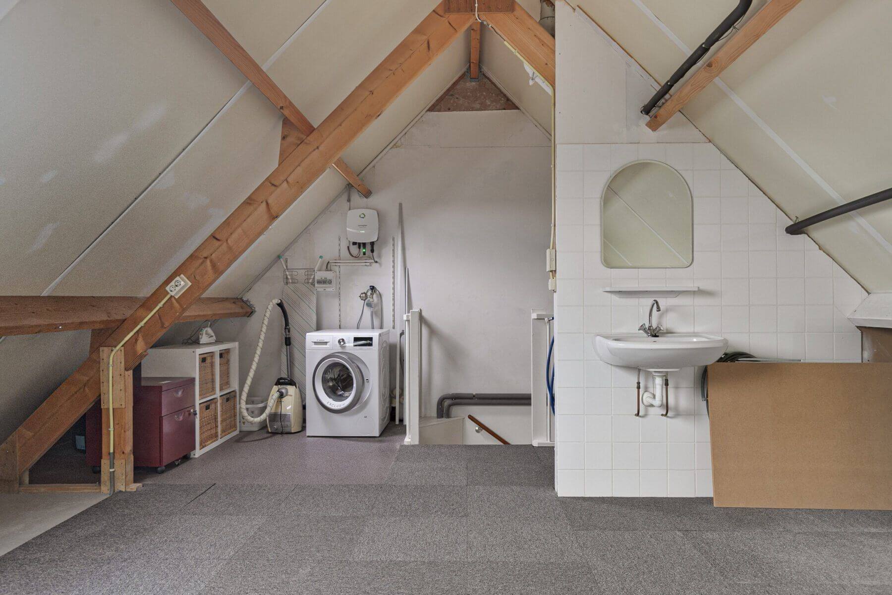 Een ruime zolderkamer met wasbak, extra kleding/opbergkasten, wasmachine en CV installatie.
