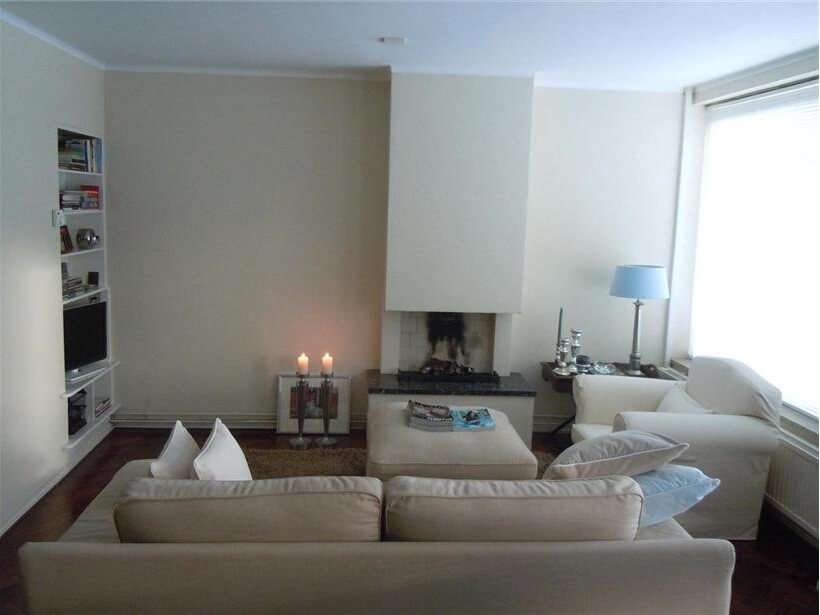 De lichte woonkamer met een klein Frans balkon heeft een prachtige visgraat parket vloer en openhaard (gas) en ademt hierdoor veel sfeer uit.