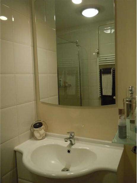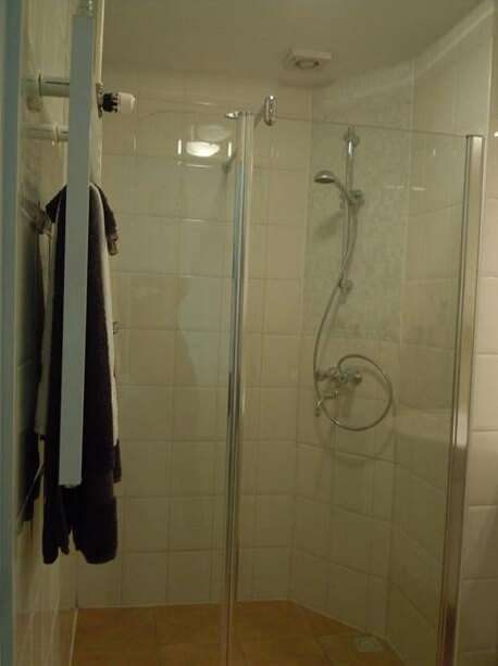 De nette badkamer heeft een ruime inloopdouche, een wastafelmeubel en een designradiator.