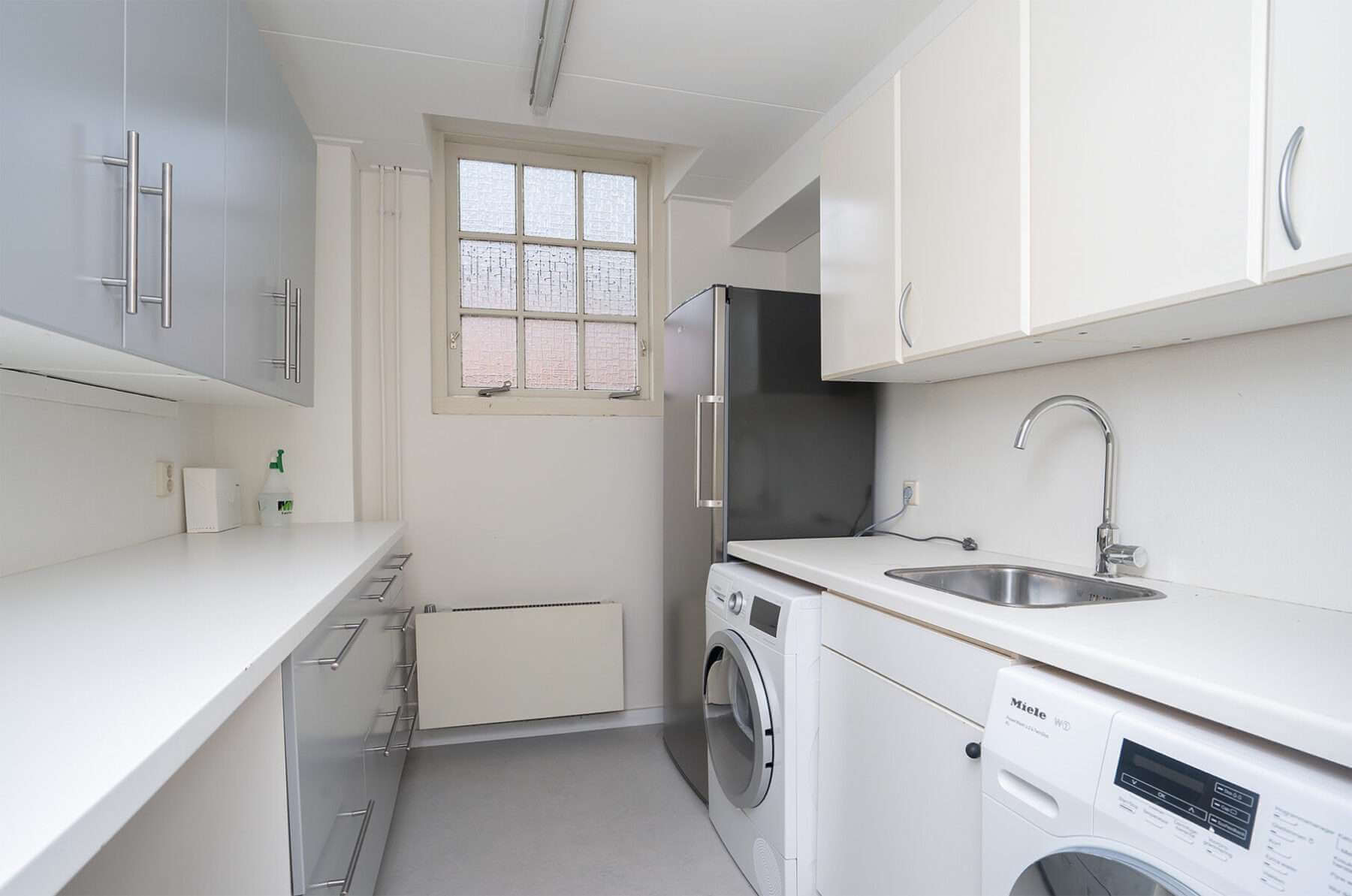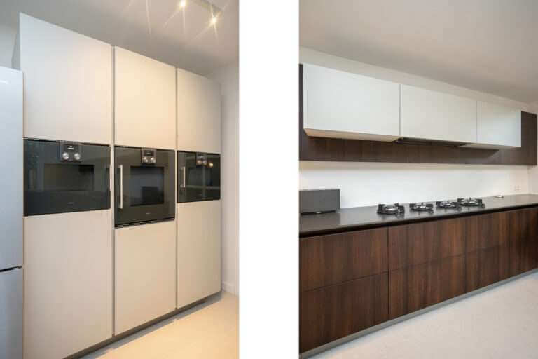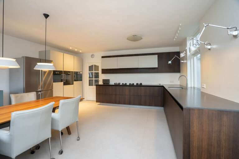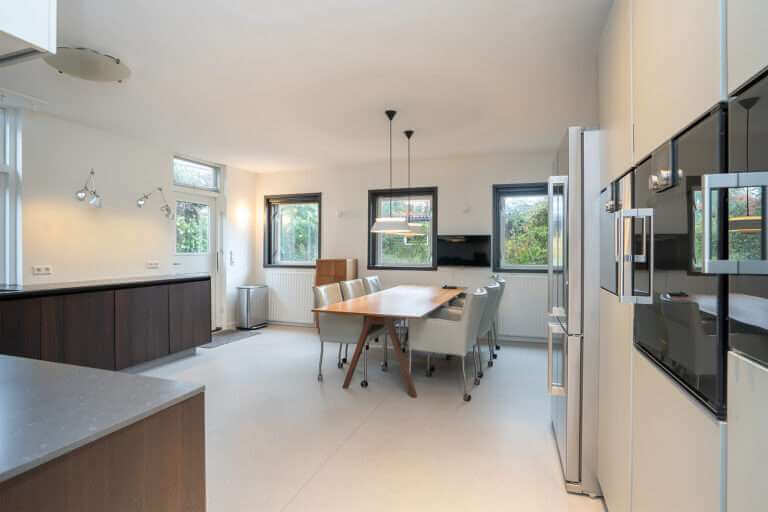 Via de hal loopt u naar zowel de bijkeuken (met o.a. wasmachine en Amerikaans koelkast) als naar de ruime leef-keuken, die van alle gemakken is voorzien; vloerverwarming, groot Pitt gasstel, afwasmachine, heteluchtoven, stoomoven en combi magnetron van Gaggenau. Grote koelvrieskast van Smeg en een Quooker kraan.