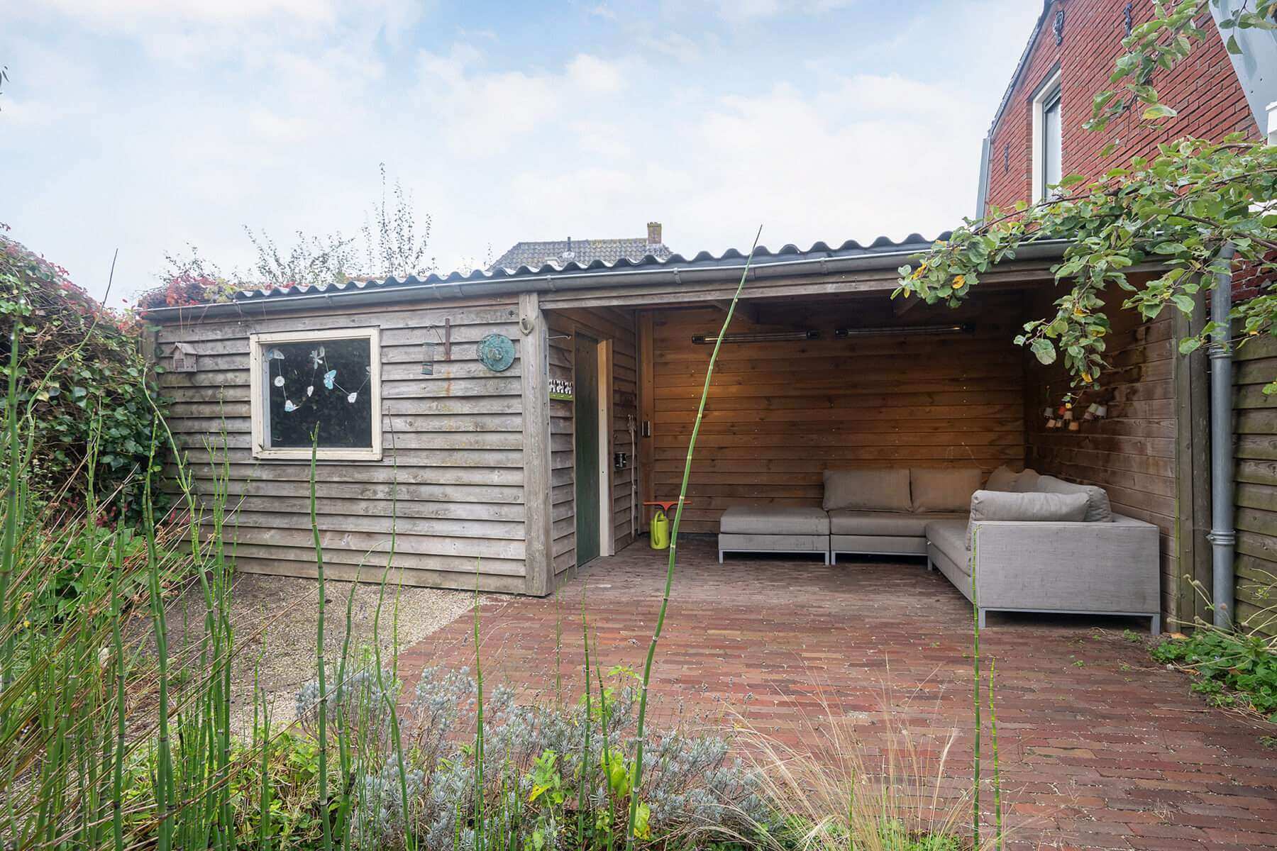 De woning heeft ook een fijne tuin (bloementuin met appelboom en minivijver) die afgesloten kan worden middels een hek. Daarnaast is er een overdekte serre en een grote schuur aanwezig op eigen terrein.