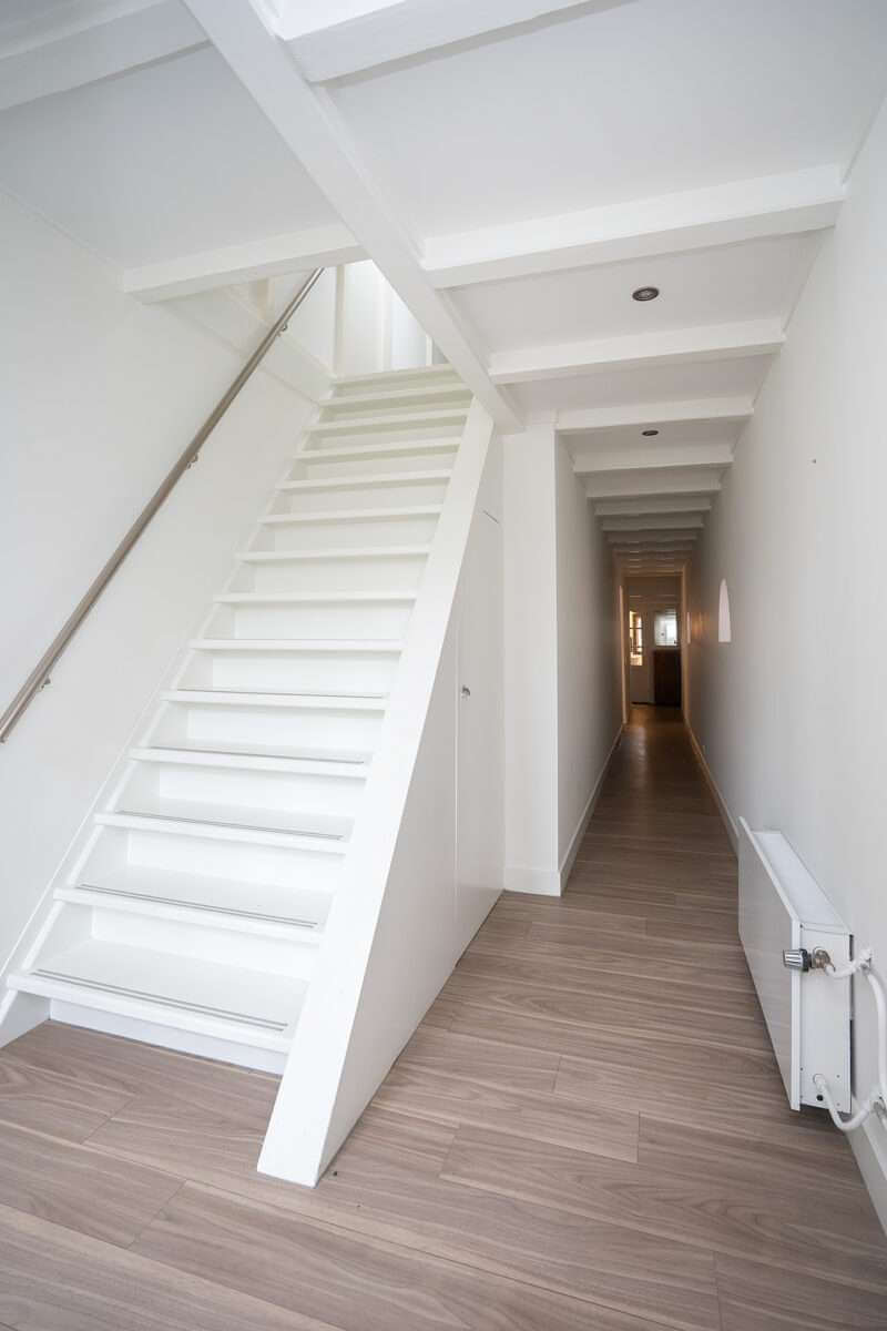 De hal verbindt de woonkamer met vloerverwarming en hout gestookte openhaard en tevens half open studeerkamer met kastenwand voor kantoorbenodigdheden.