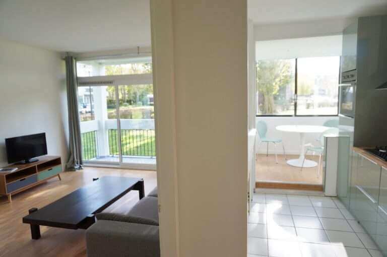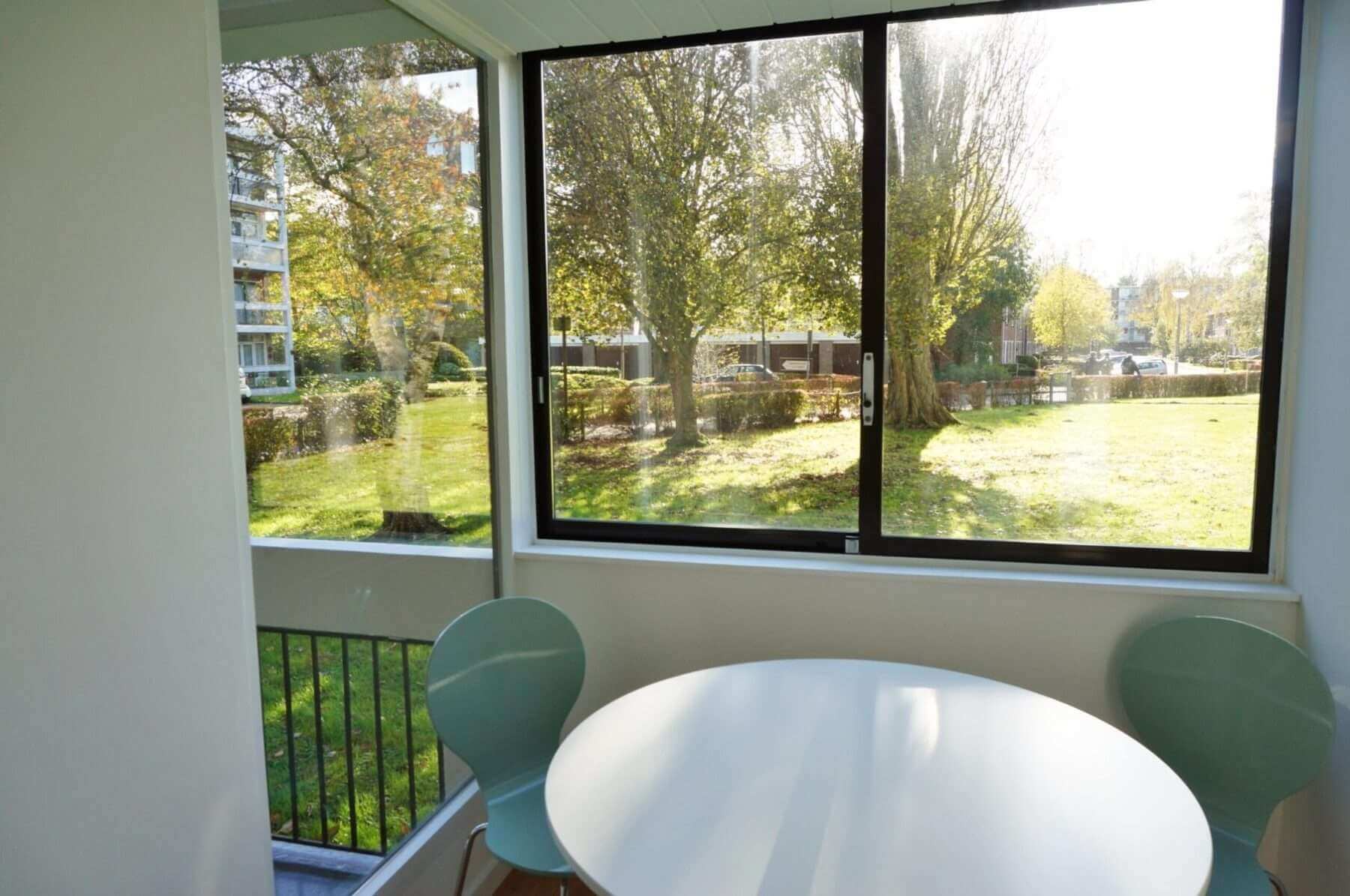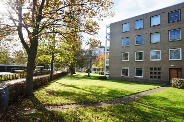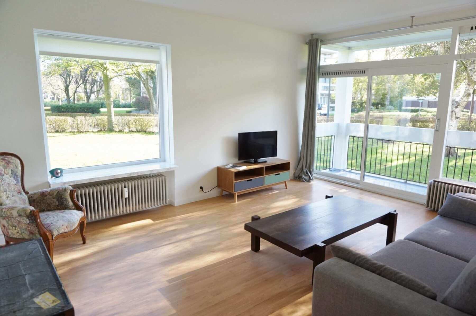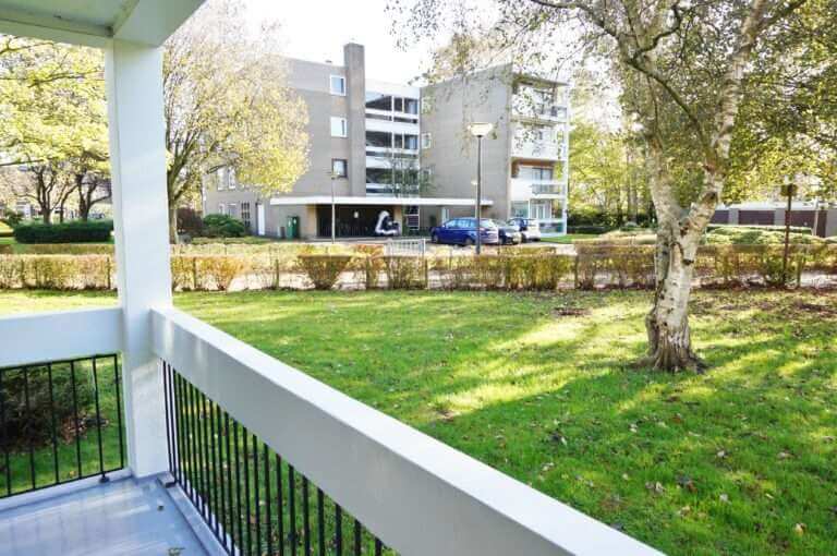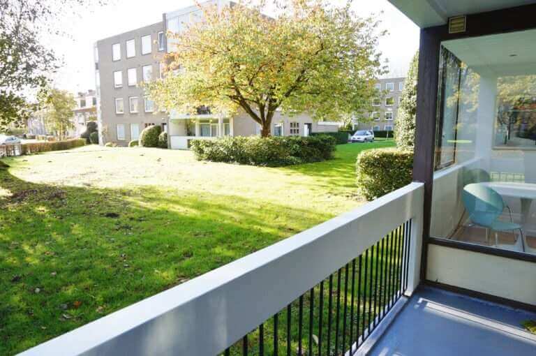 1 slaapkamer hoek- appartement gelegen op de begane grond, met een ruim balkon op het zuiden en vrij uitzicht op de parkachtige gezamenlijke tuin.