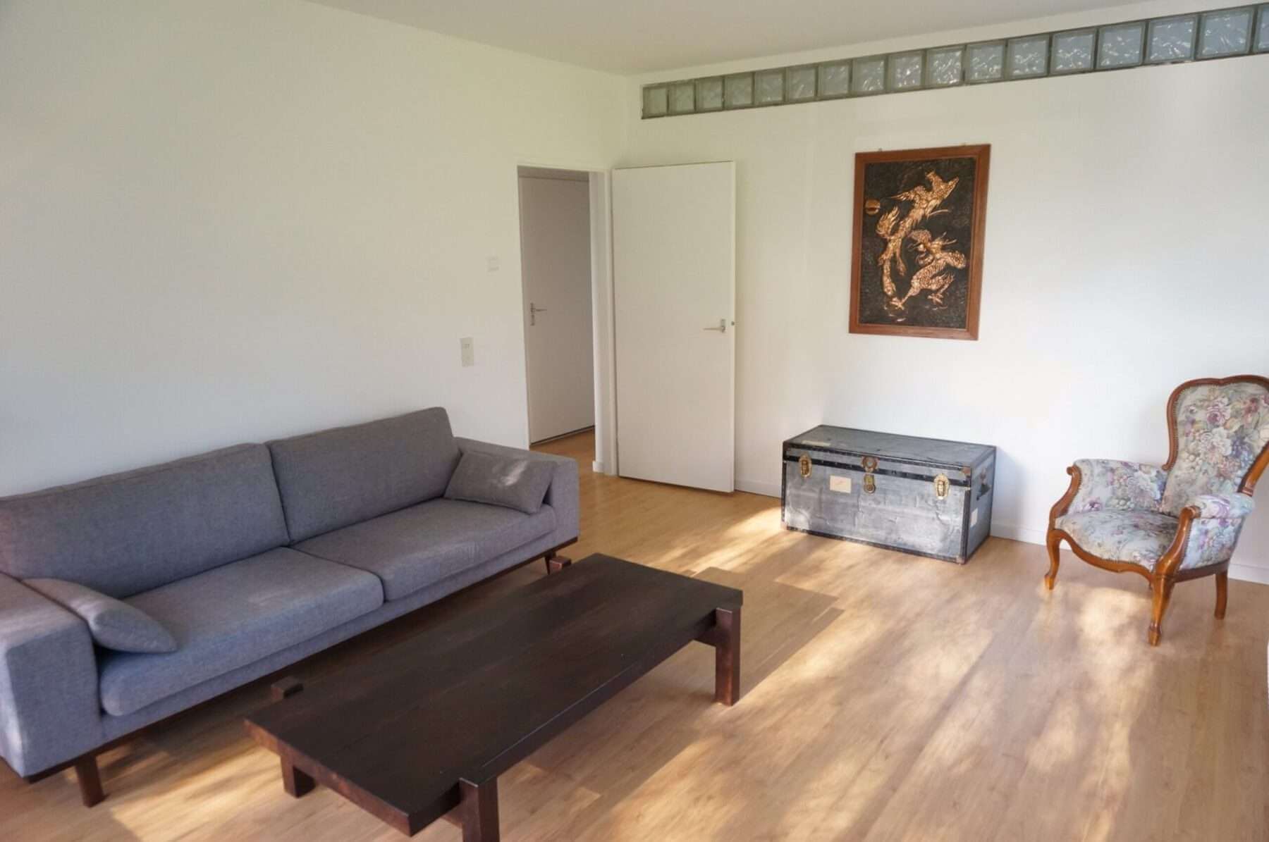 De lichte en ruime woonkamer heeft een prachtig vrij en wijds uitzicht op de tuin en omgeving.