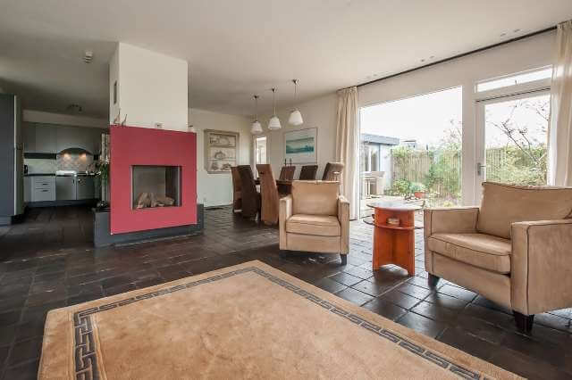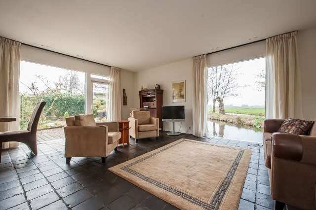 De ruime woonkamer heeft veel en grote raampartijen tot op de grond, met uitzicht op het water, natuur en tuin. De kamer is voorzien van een oude Franse klooster plavuizenvloer en heeft een gezellige open gashaard.