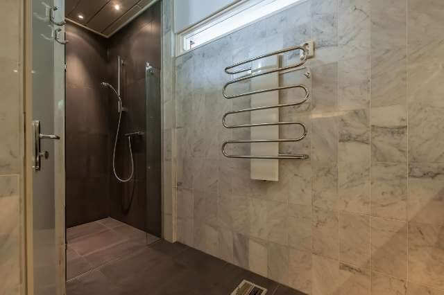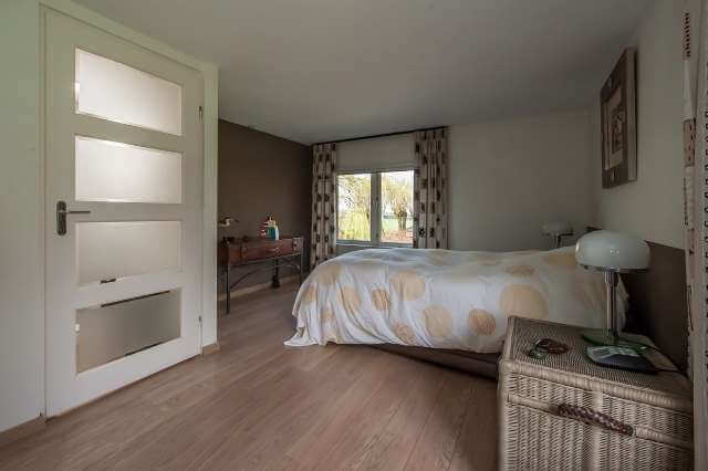 De grote en lichte slaapkamer is vanuit de hal te bereiken met twee treetjes, heeft uitzicht op water en de tuin. Ook hier valt de grote mate van privacy weer op.