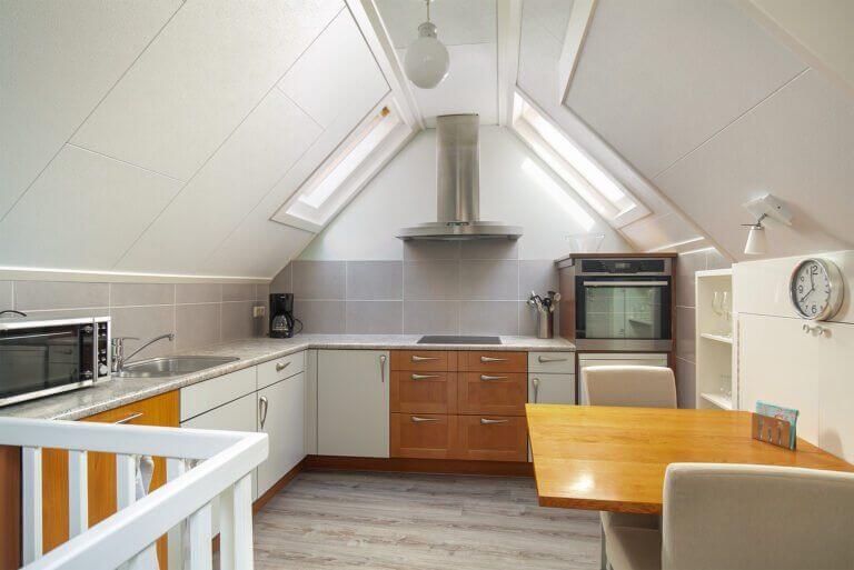 terug naar de overloop op de 1e verdieping bereikt u via een vaste trap het woongedeelte met gezellige woonkamer en open keuken op de 2e verdieping De keuken is voorzien van diverse inbouwapparatuur, zoals een vaatwasser, keramische kookplaat, afzuigkap, gootsteen, koelkast met vriesvlak en een vrijstaande combi oven magnetron.