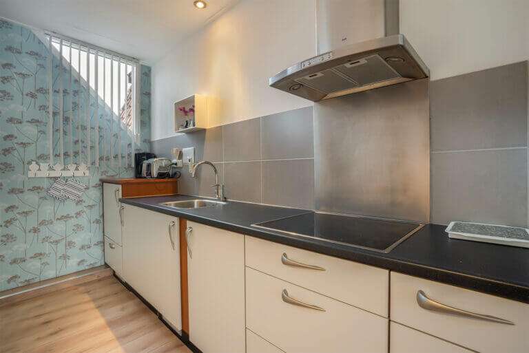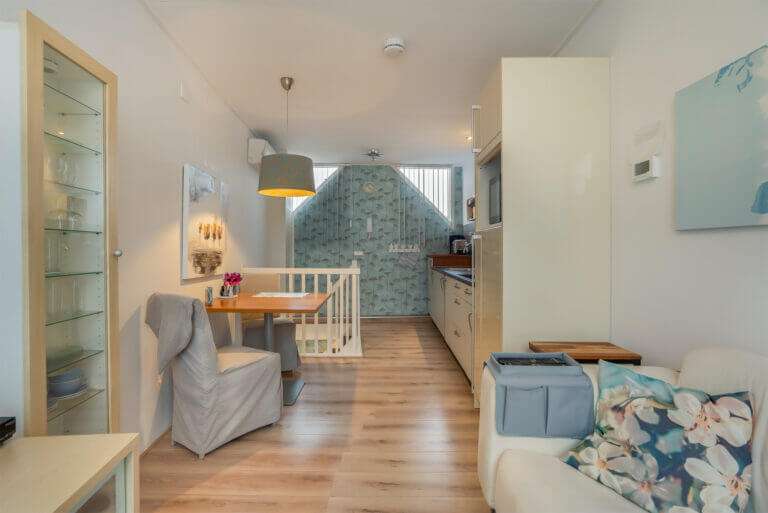 Vanuit de slaapkamer bereikt u via een vaste trap het woongedeelte met gezellige woonkamer en open keuken. De keuken is voorzien van diverse inbouwapparatuur, zoals een vaatwasser, keramische kookplaat, afzuigkap, gootsteen, koelkast met vriesvlak en een vrijstaande combi oven magnetron.
