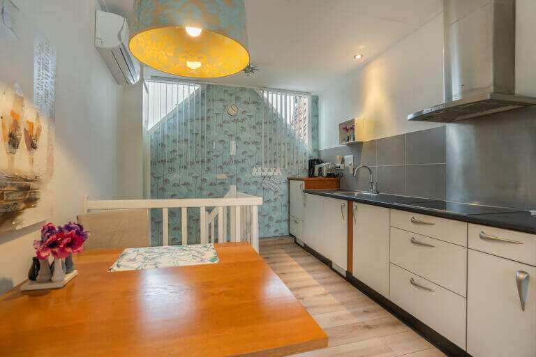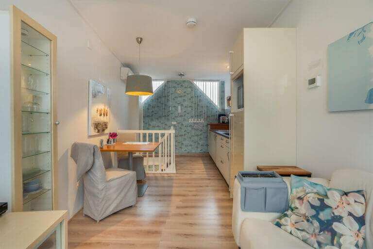 Vanuit de slaapkamer bereikt u via een vaste trap het woongedeelte met gezellige woonkamer en open keuken. De keuken is voorzien van diverse inbouwapparatuur, zoals een vaatwasser, keramische kookplaat, afzuigkap, gootsteen, koelkast met vriesvlak en een vrijstaande combi oven magnetron.