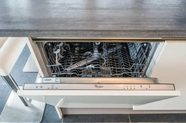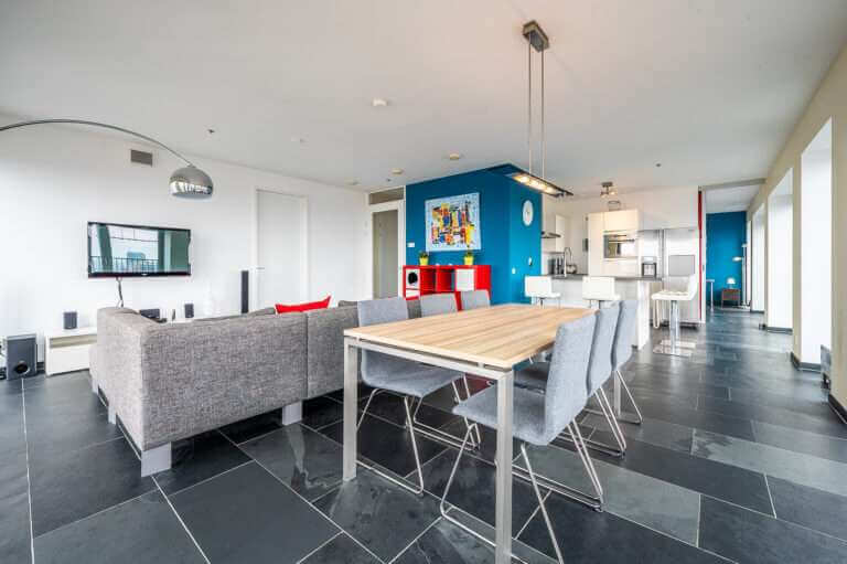 De woonkamer, keuken en hal hebben een tegelvloer.