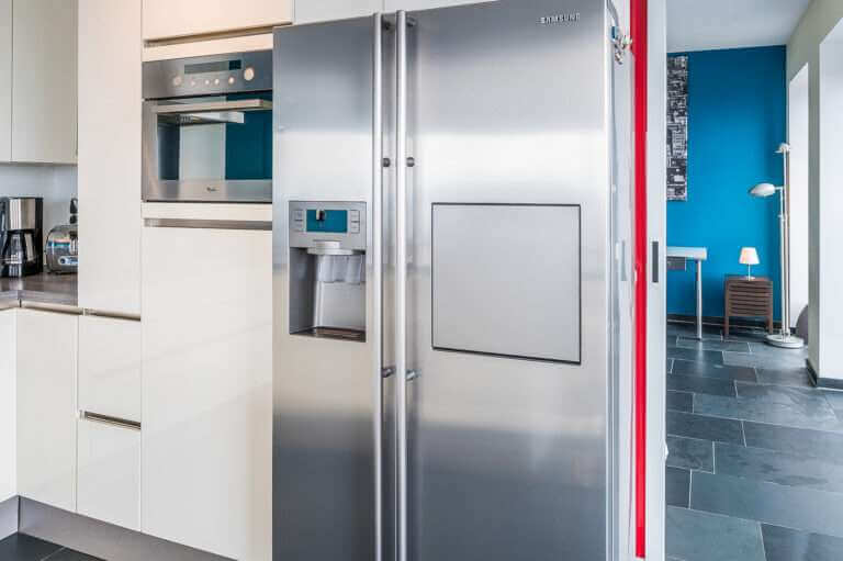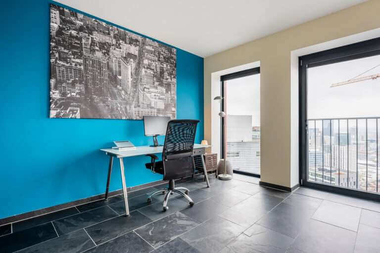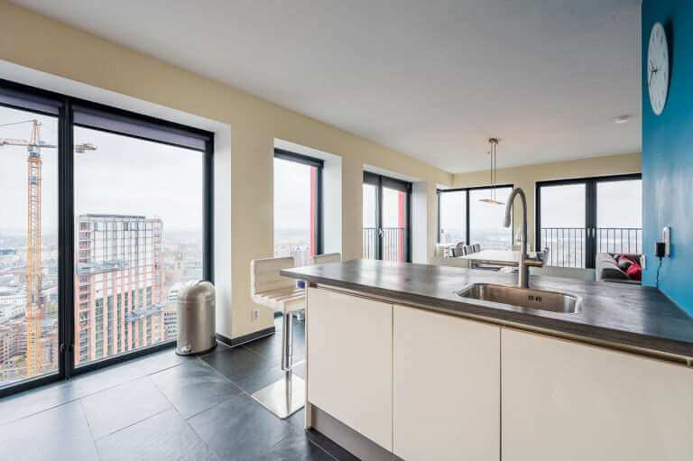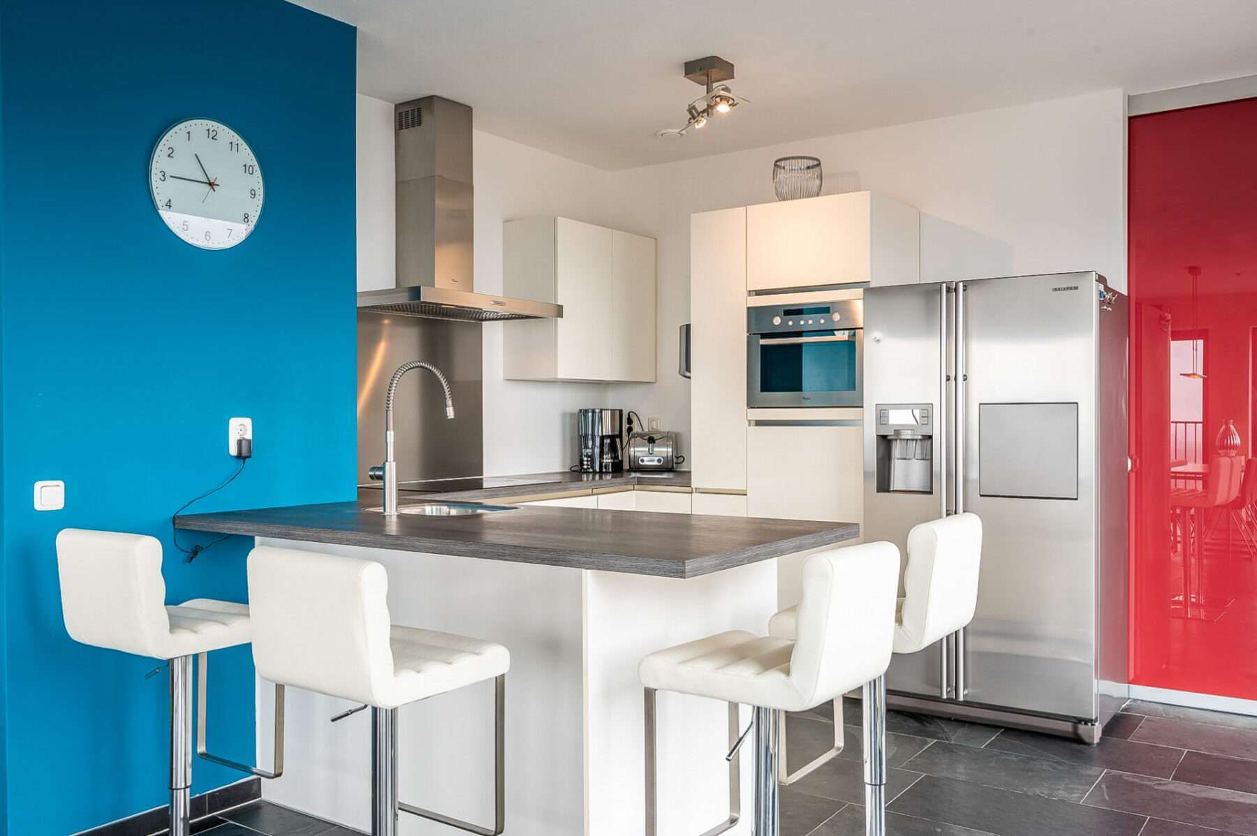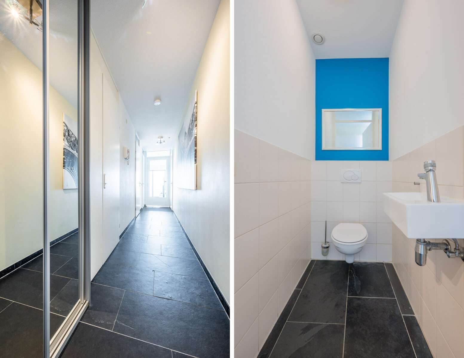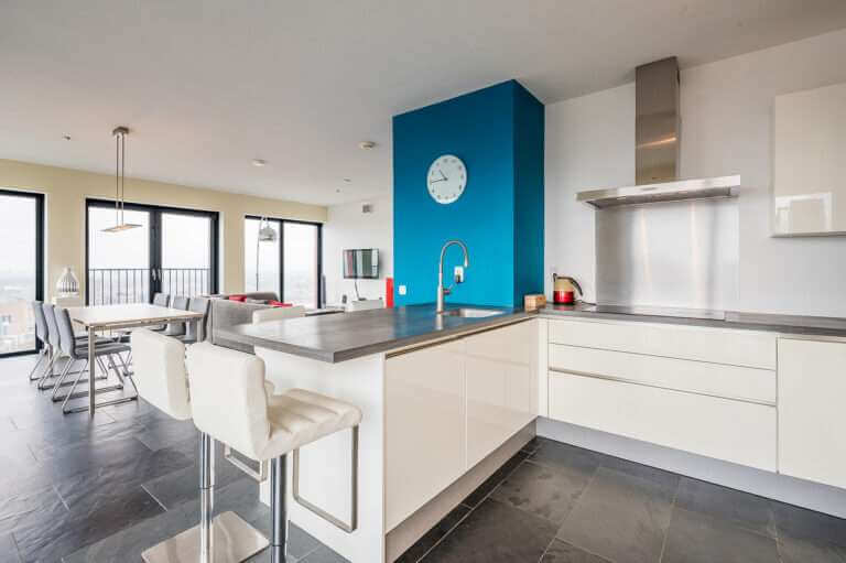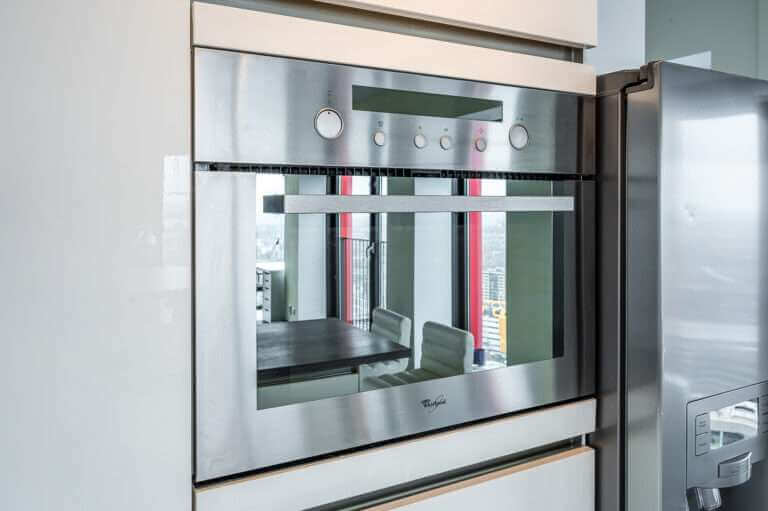 36e verdieping: entree appartement, ruime hal, meterkast, toilet en wastafel, toegang tot de ruime woonkamer met open keuken (totaal: ca. 45 m2). Als inbouwapparatuur vindt u een 4-pits inductiekookplaat, een afzuigkap, een elektrische oven / magnetron, Amerikaanse koelkast / vriezer en vaatwasser.