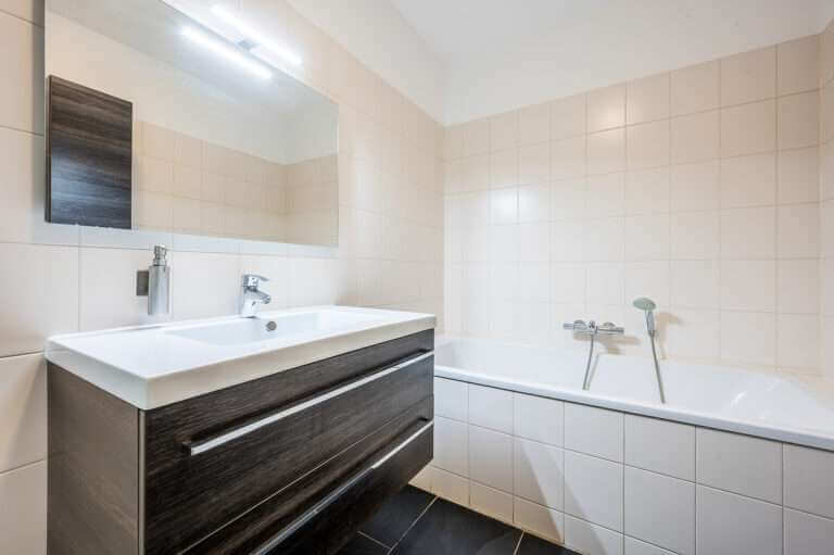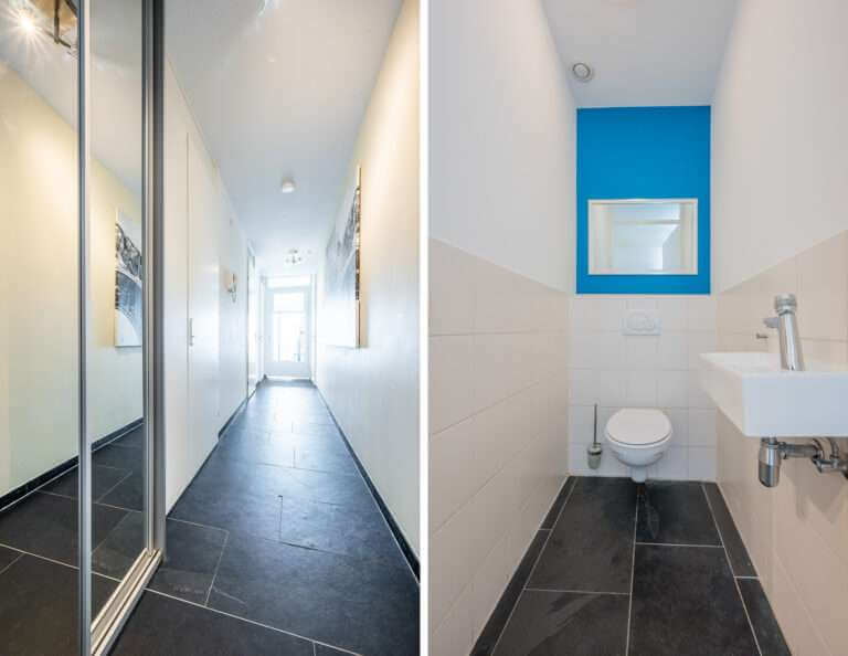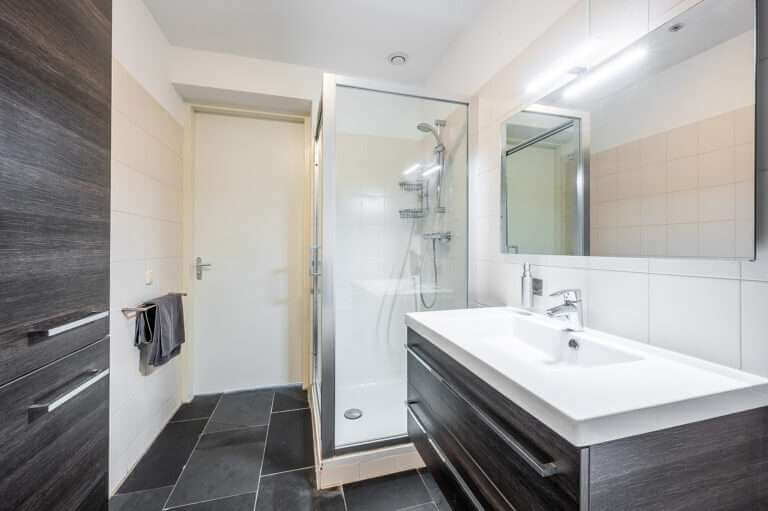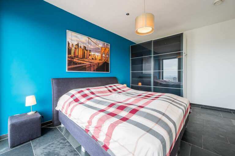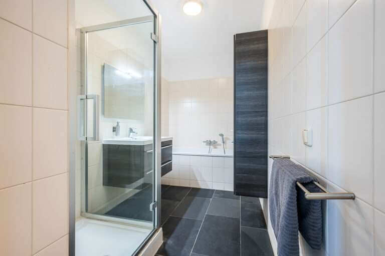 Het appartement heeft twee ruime slaapkamers (circa 4.35 x 3.27 m en ca. 4.48 x 4.45 m) en een ruime badkamer met ligbad, douchecabine (ca. 0.90 x 0.90 m), wastafelmeubilair en vloerverwarming. In de gang bevindt zich een grote bergkast (ca. 1.22 x 2.38m) met ruimte voor het warmtesysteem, vloerverwarming en de wasmachine en droger.