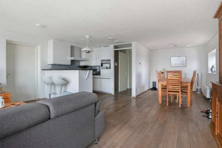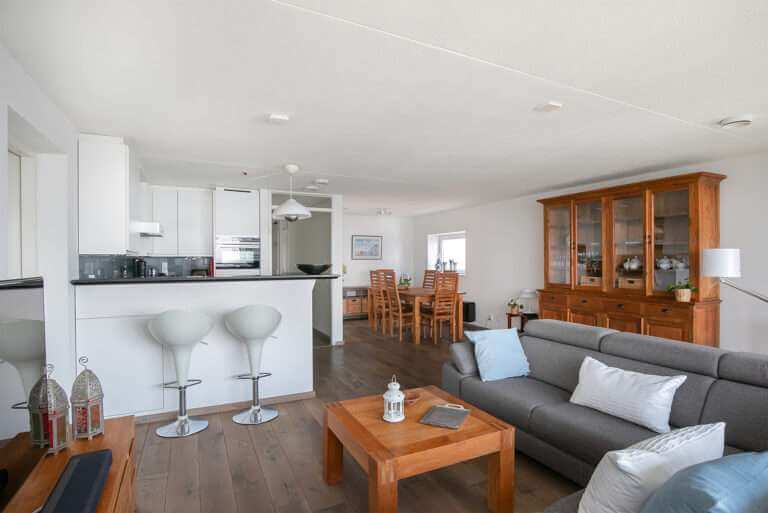 Prachtig ruime en lichte woonkamer met open keuken en toegang tot het ruime balkon.
