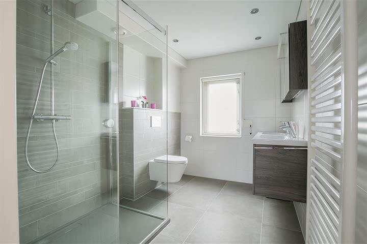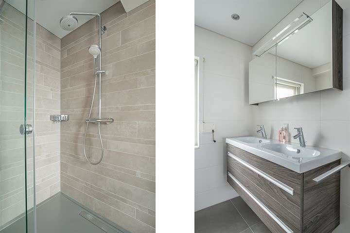 De moderne badkamer (ca. 6 jaar oud) is voorzien van een inloopdouche, een toilet, een dubbel wastafelmeubel met een spiegelkast, een designradiator en spots in het spanplafond.