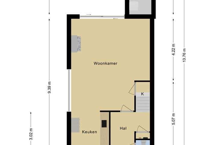 Woonkamer : 9,39 x 5,39 (totale lengte x breedte begane grond)
